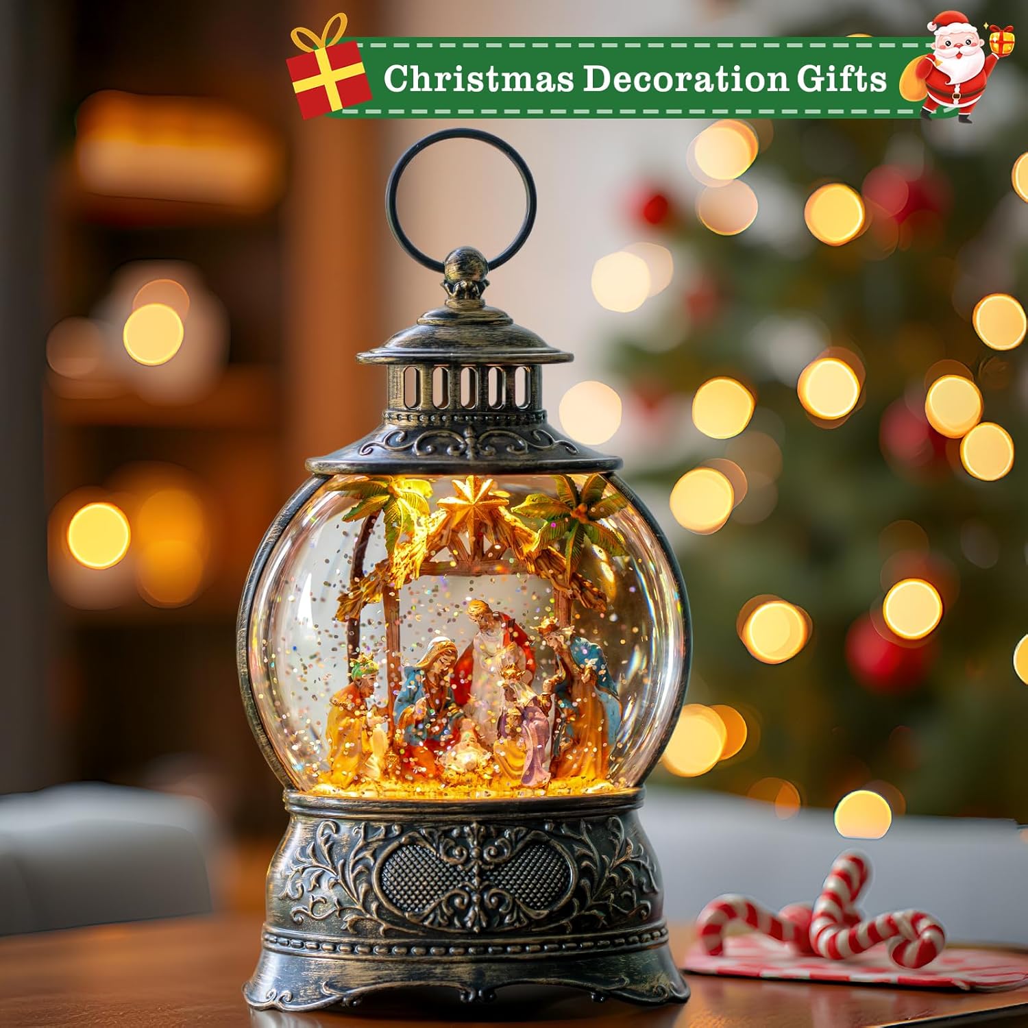 Christmas Snow Globes Lantern Christmas Snow Globe with Music Holy Family Nativity Scene,6H Timer,USB Lined/Battery Operated Lighted Lantern for Christmas Festival Decoration Gifts