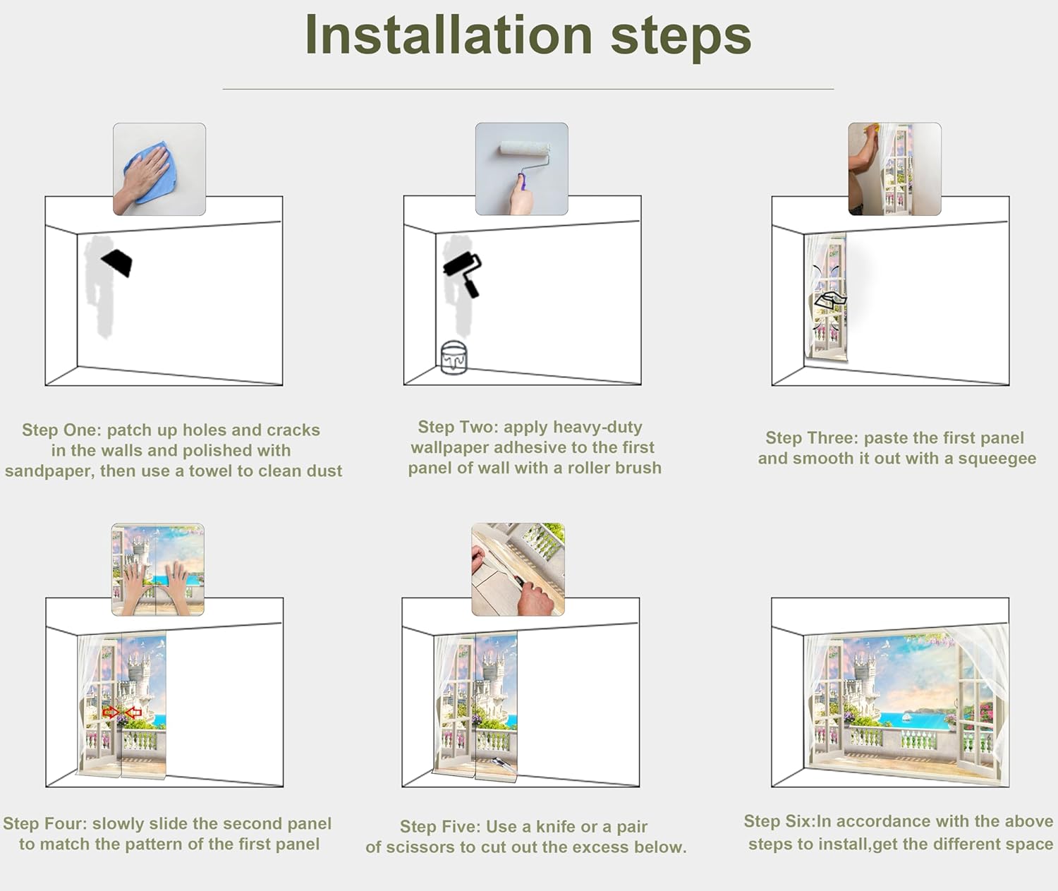 - INSTALLATION - 1.Fill in all cracks or holes and clean dust dirt and grease on the wall surface. 2. Apply the heavy duty wallpaper paste on the wall not mural. 3. Use a spirit level to mark first strip location. 4. match the pattern by sliding into place. 5.use a scraper to smooth out bubbles press. 6. Let dry for a few minutes and that's it! Please Note: Not self-adhesive. We recommend to use a standardized fleece wallpaper paste.