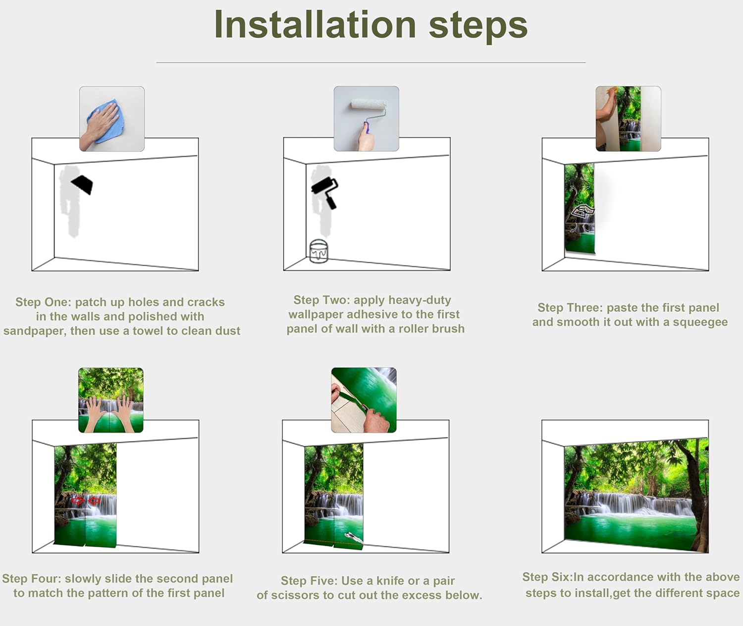 - INSTALLATION - 1.Fill in all cracks or holes and clean dust dirt and grease on the wall surface. 2. Apply the heavy duty wallpaper paste on the wall not mural. 3. Use a spirit level to mark first strip location. 4. match the pattern by sliding into place. 5.use a scraper to smooth out bubbles press. 6. Let dry for a few minutes and that's it! Please Note: Not self-adhesive. We recommend to use a standardized fleece wallpaper paste.