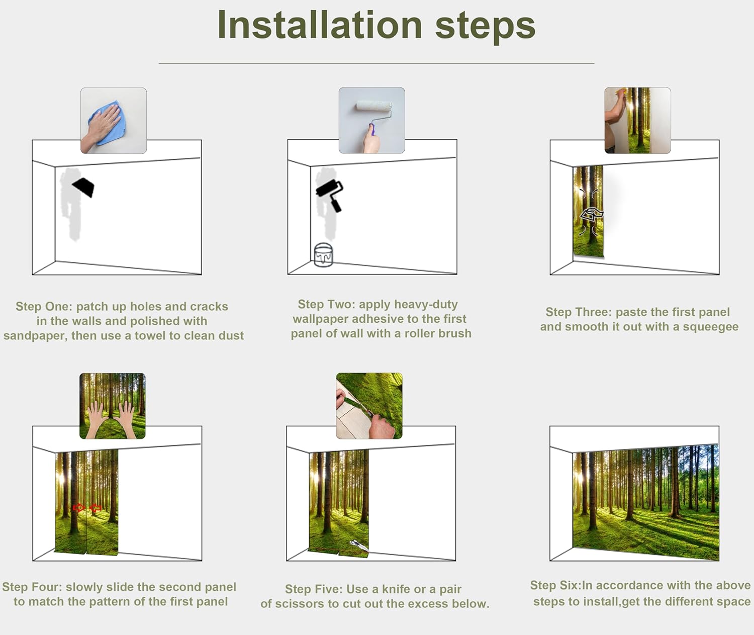 - MATERIAL - Green forest murals for walls is made of premium silk material. Ecological printing with lightfast, UV resistant lasting colors. Durable and waterproof, fadeless and odorless, non-toxic and eco-friendly.