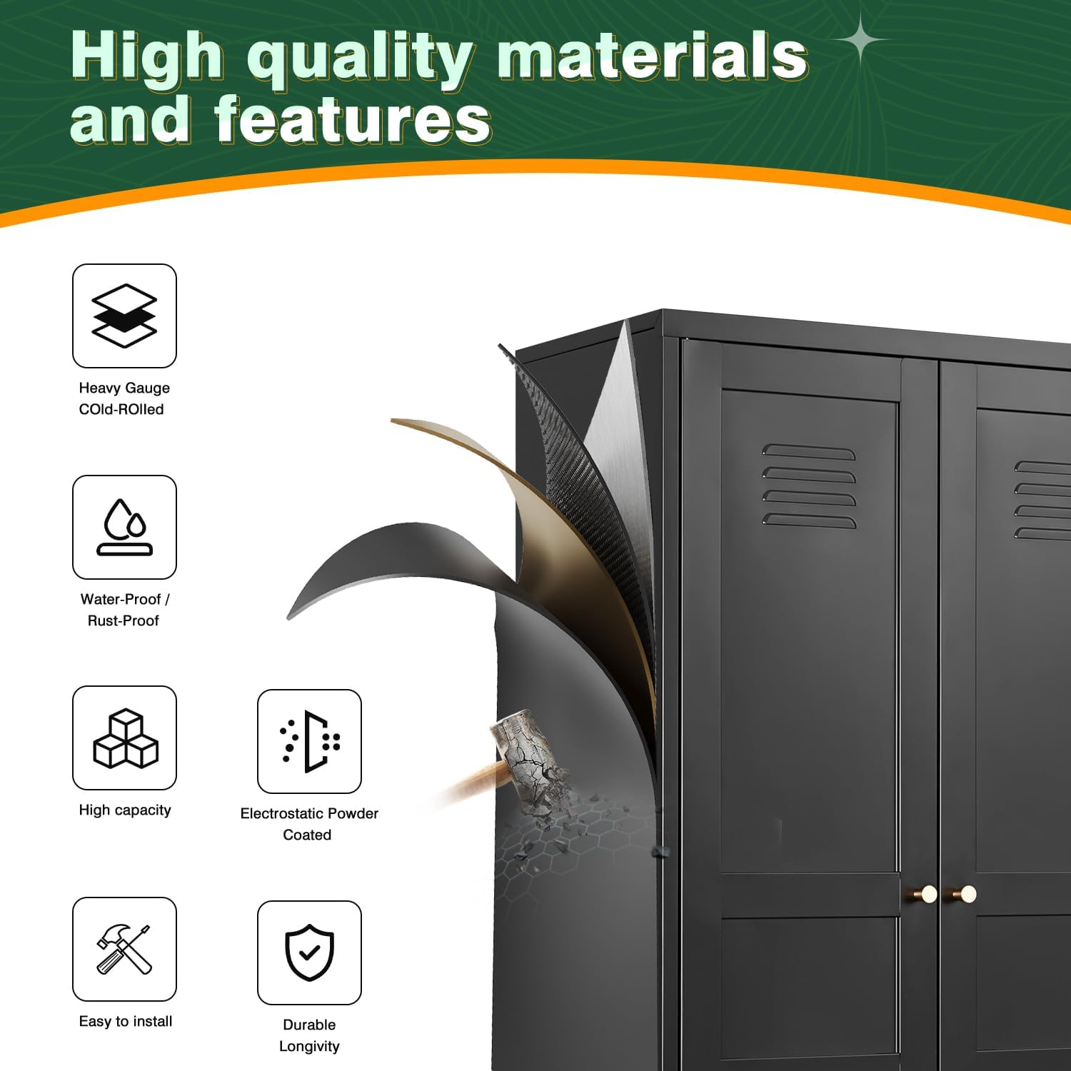 - Practical Design:Each door has 2 magnetic devices to ensure that the door is tightly closed;Two reserved holes on the back panel can be fixed on the wall; Metal cabinet with 4 adjustable shelves,5-floor storage space suitable for a variety of storage applications,improve space utilization by 80% compared to three-layer cabinets