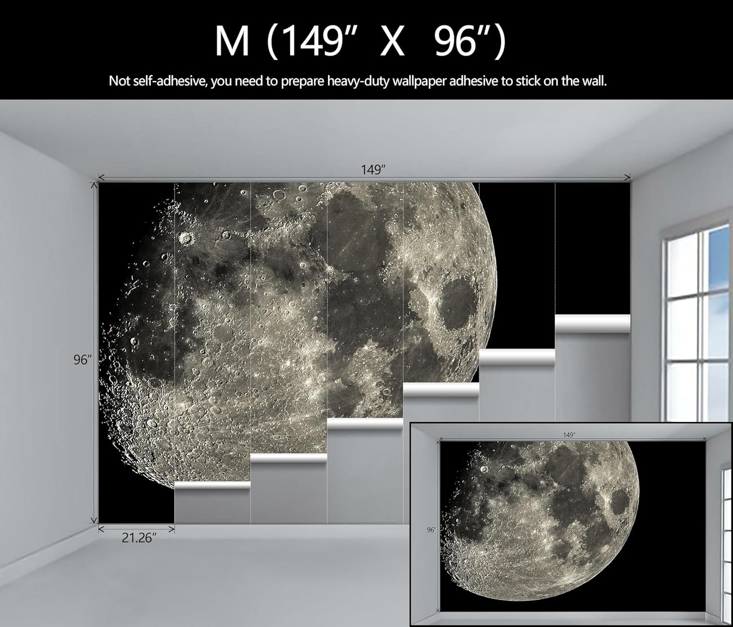 - Mural Size: The total size of this mural wallpaper is 149" x 96" / 378CM x 244CM (W x H), cut into 7 pieces, each measuring 21.26" x 96", for easy installation.