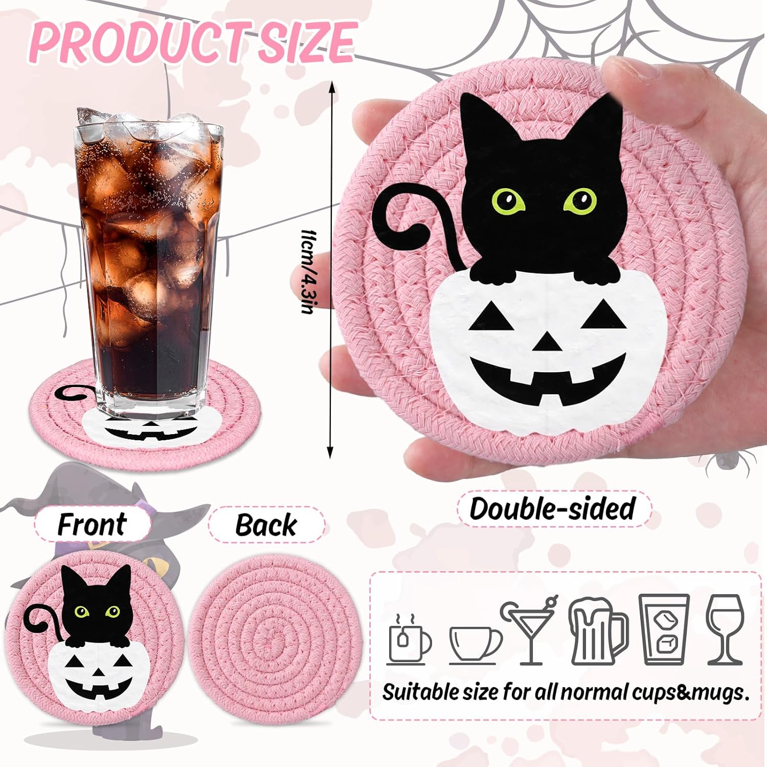 Whaline Halloween Handmade Braided Cotton Coasters Pink Cute Ghost Boo Black Cat Drink Coasters Absorbent Cup Coasters for Halloween Party Home Office Decor, Set of 4