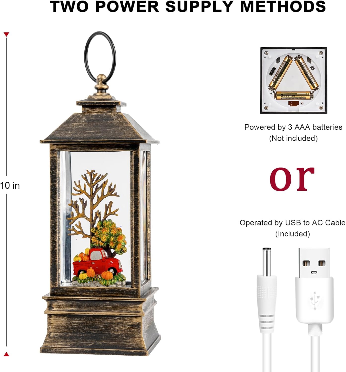 - đă2 Mode Power SupplyăPowered by USB to DC cable (include), the snow globe lantern can be operated without batteries, which can save you a lot on batteries. & Powered by 3 AA batteries (not included), you can place it at any place that you want to add warm ambiance.