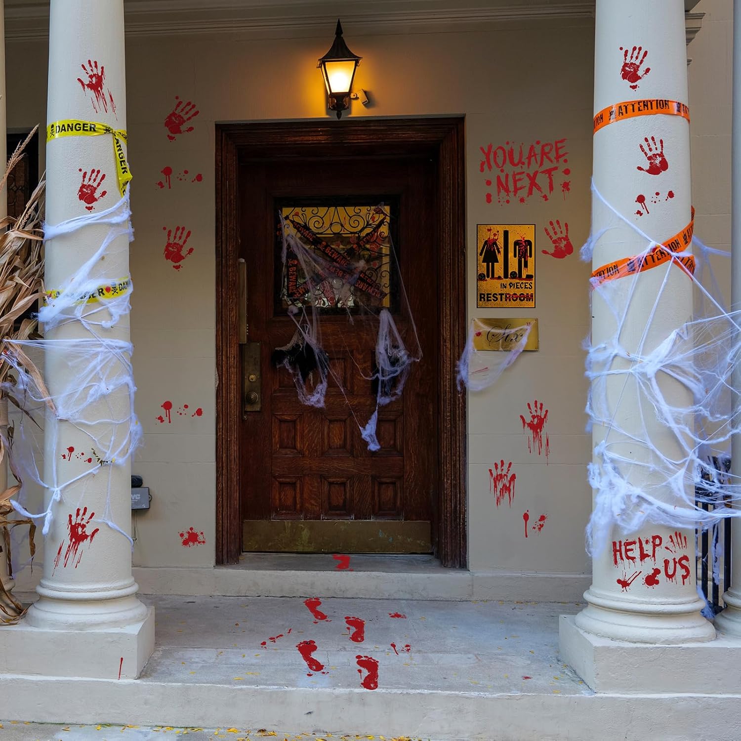 - What Youâll Get: 12 Halloween window clings, including 7 bloody footprint stickers, 2 realistic bloody handprint clingsďźrestroom sign stickers and 2 signsââDo Not Enterâ and âDo Not Leave.â Each sticker features a vivid red hue and intricate design to create an authentically terrifying atmosphere. Perfect for adding a spine-chilling touch to any space, making your Halloween setup truly unforgettable.
