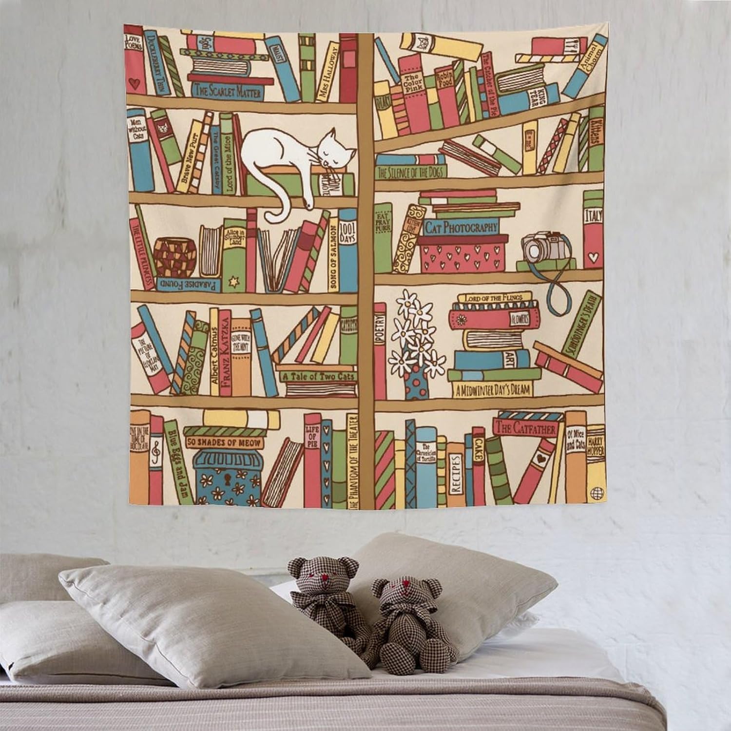 Kurtect Bookshelf Tapestry,Cute Cartoon Cat Sleeping Library Theme Pattern Print Tapestries for Party Beach Picnic Blankets Tablecloths Living Room Wall Deocr, 60x60 in
