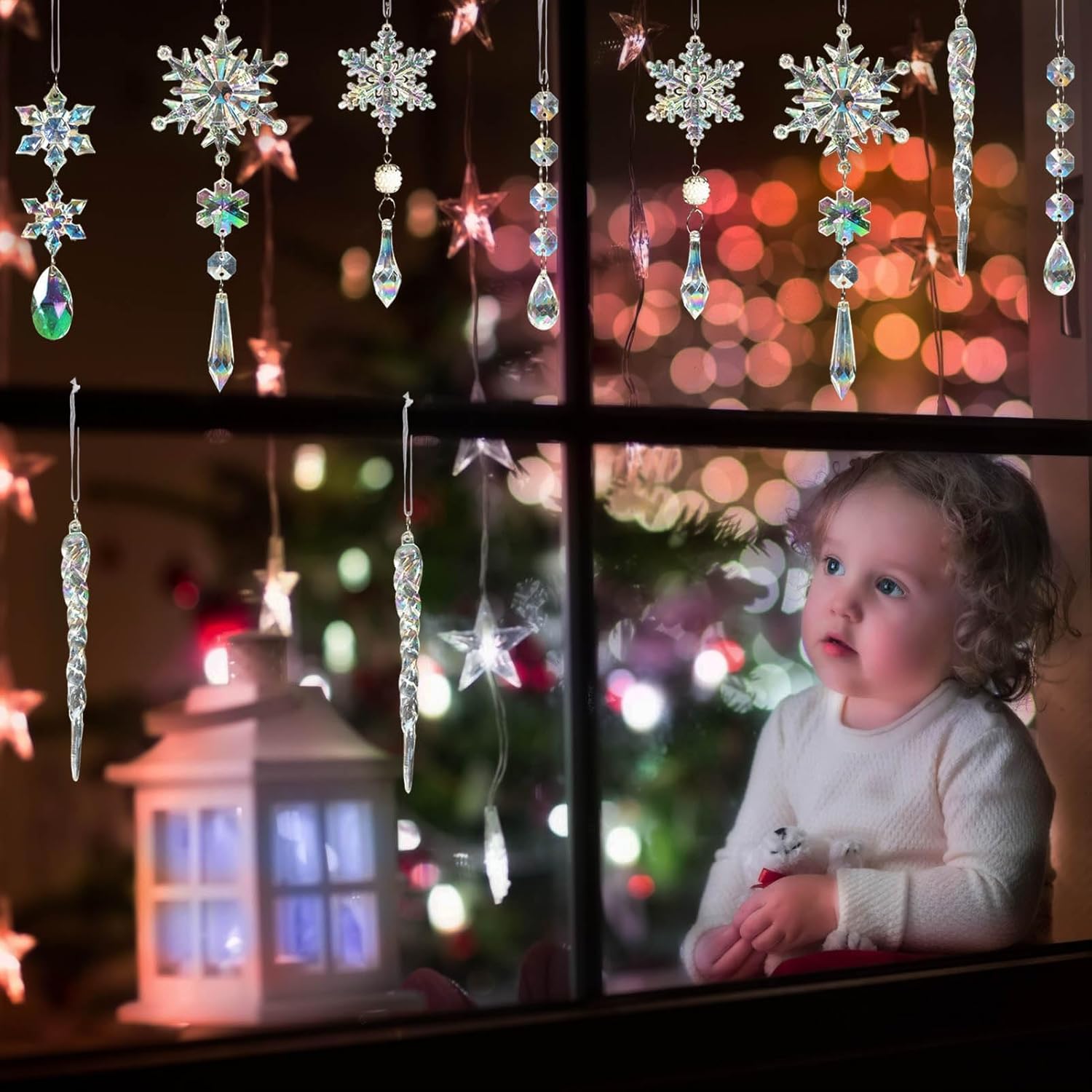 - VALUABLE PACK: This pack offers an impressive 18pcs crystal iridescent ornaments, including 5pcs icicles, 5pcs crystal beads garlands, 3pcs large snowflakes, 3pcs middle snowflakes and 2pcs small snowflake ornaments. These intricate designs will instantly elevate the festive charm of your Christmas tree, making it a perfect choice for your Christmas party decorations