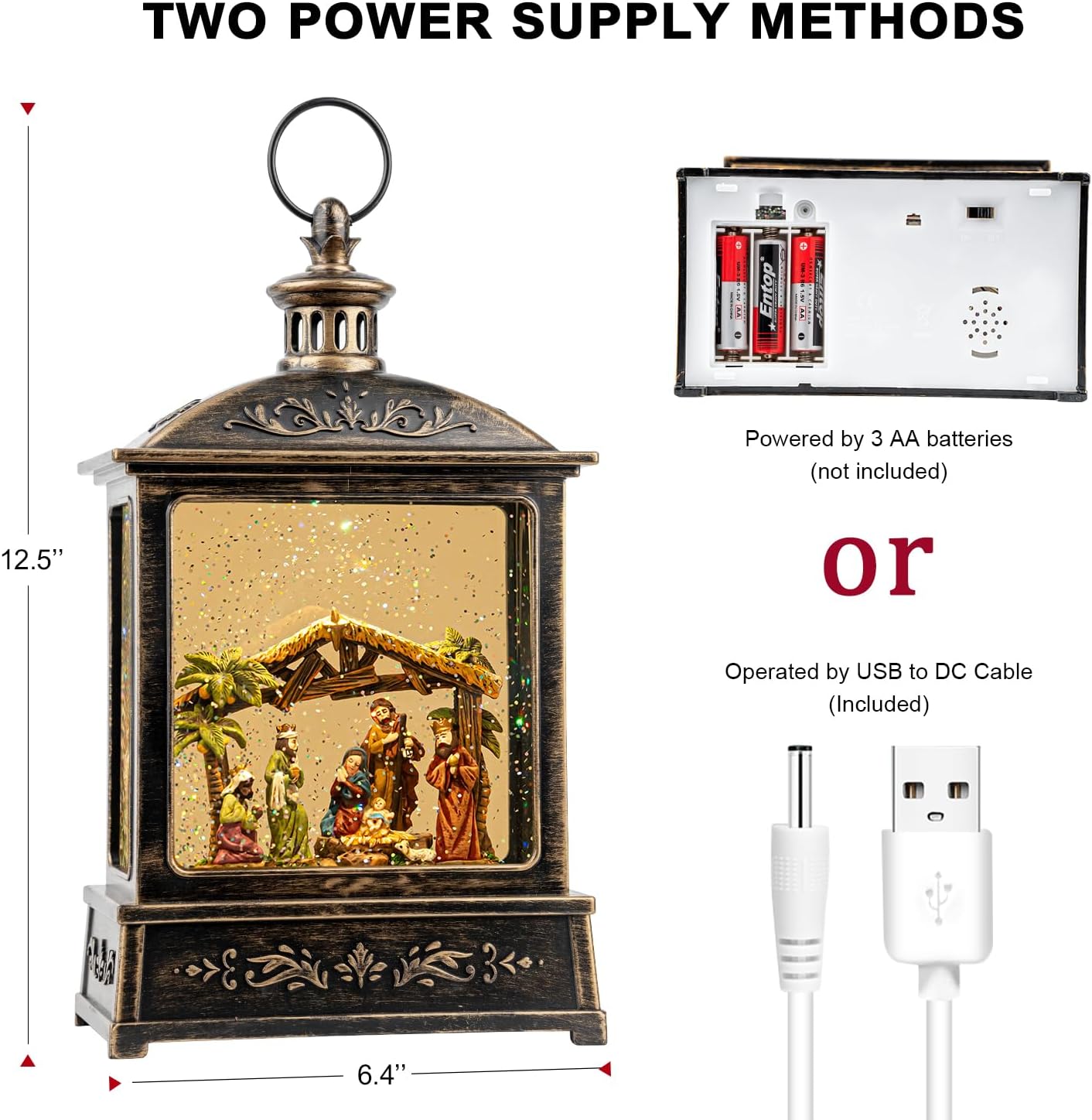 - 🎅🎄【Snow Globe Lantern】The Nativity scene Lantern design, enjoy the spirit of a Traditional Christmas With our new Holiday. When turned on a warm LED shines on the figurine and swirling glitter to gives our Christmas globe a whimsical look for the Christmas Holiday season.