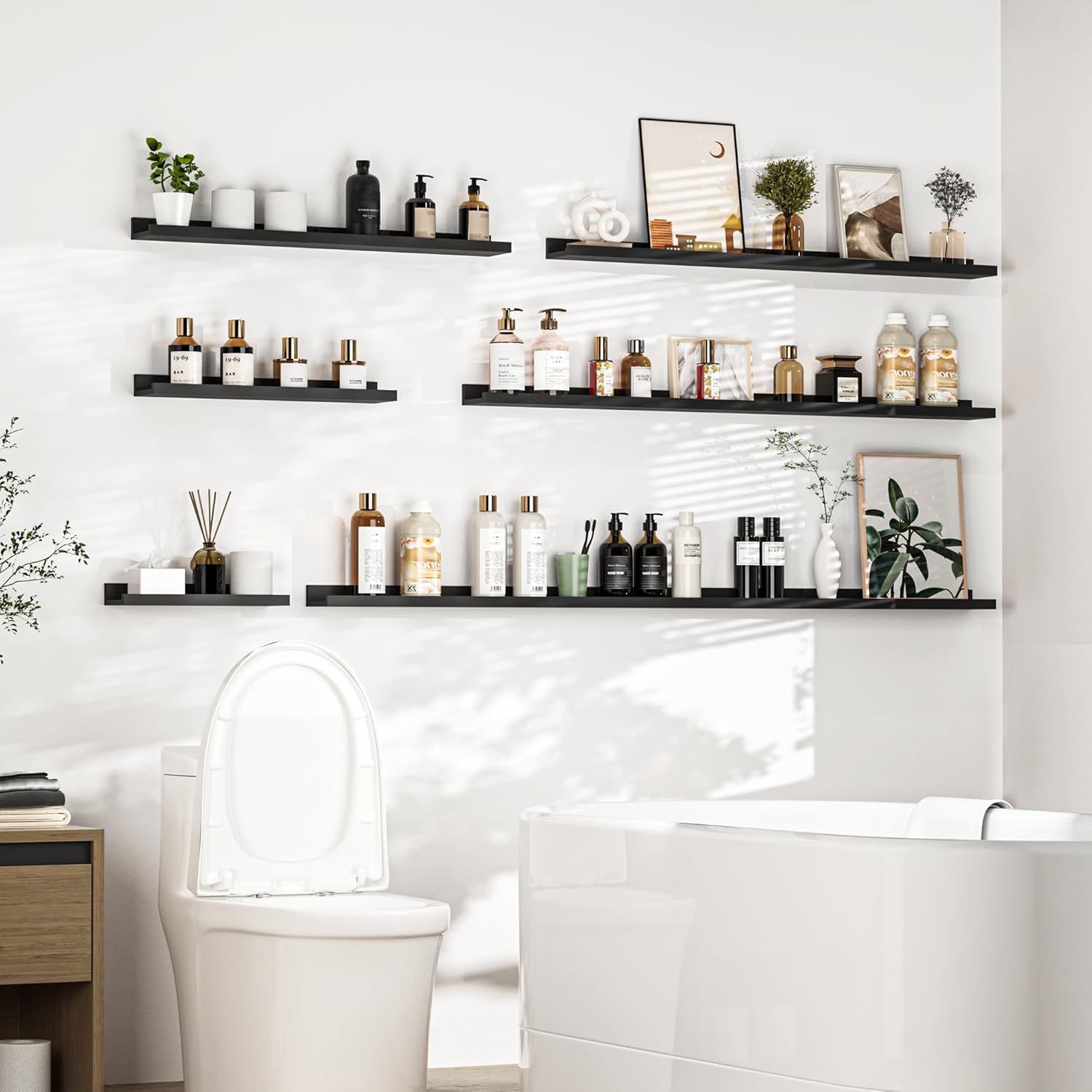 - Picture ledge Shelf for Walls: If you have dozens of pictures but don't know how to display them, Heimlove picture ledge shelves(especially large size) for walls are perfect! With our hanging shelves, store and display different types and sizes of photo frames in one place. The ledge in front of the wall shelves could prevent your precious items from falling off.