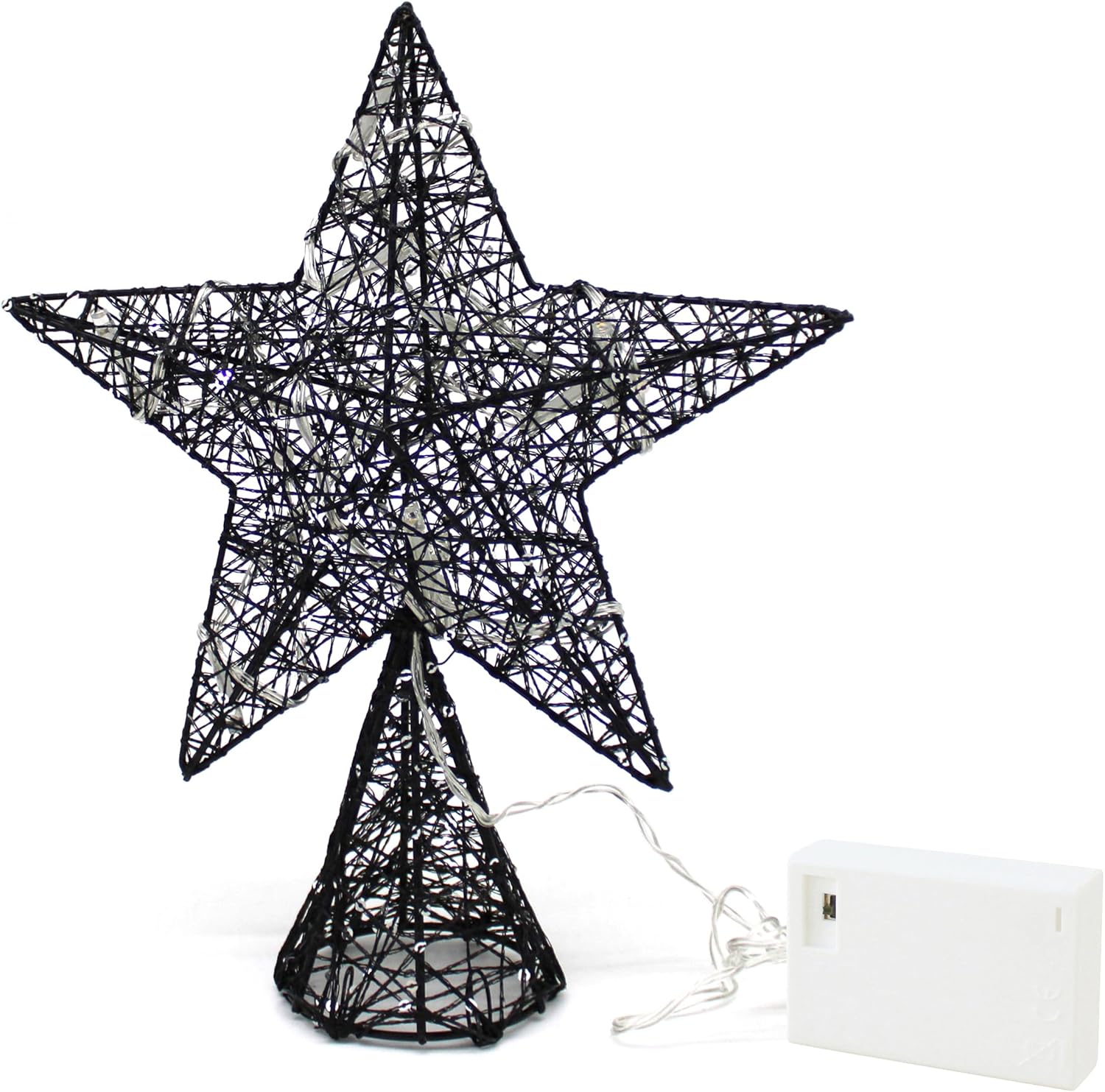 CVHOMEDECO. Black Tree Top Star with Warm White LED Lights and Timer for Christmas Tree Toppper Ornaments and Holiday Seasonal Décor, 8 x 10 Inch
