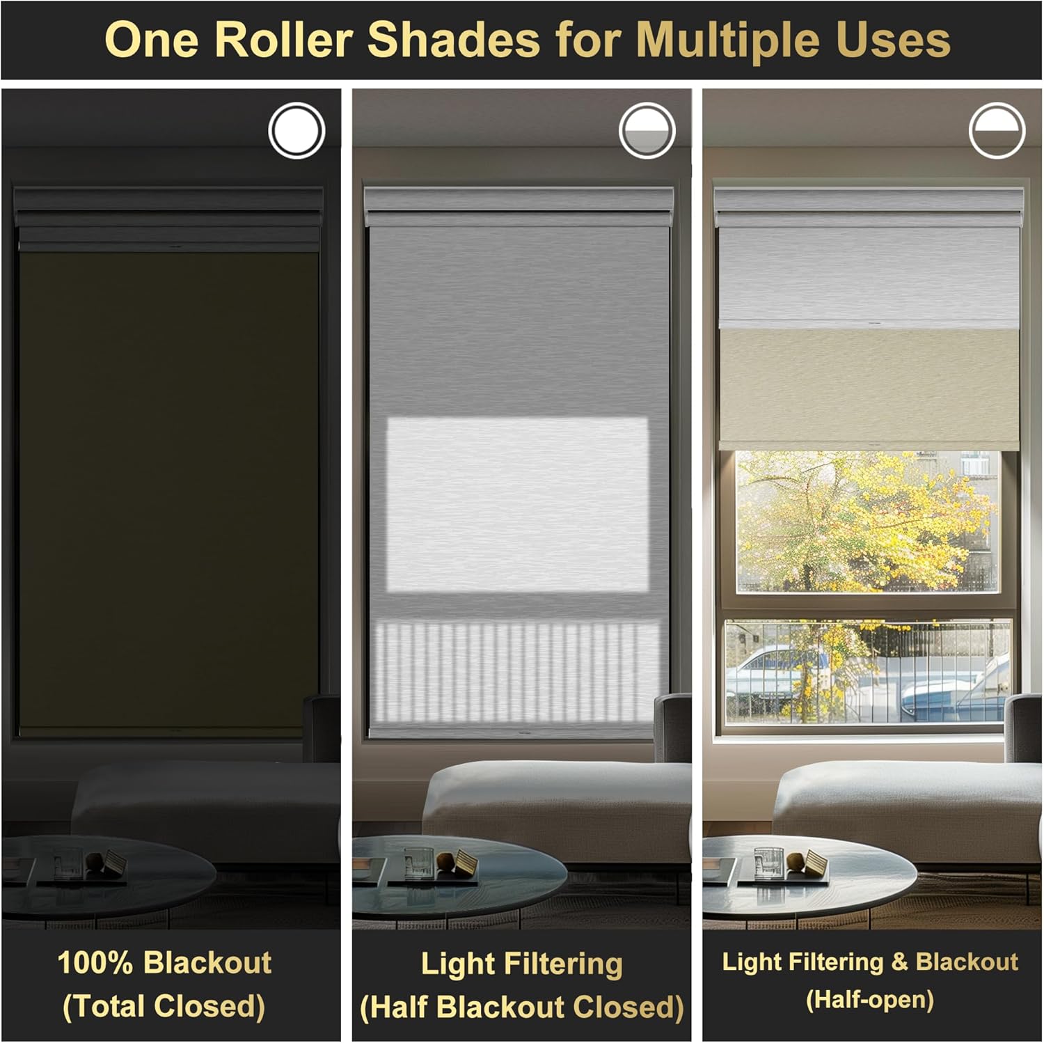 - MULTI-PURPOSE SHADE:Dual roller shades consisting of blackout and light filtering shades, blackout roller shade can 100% blackout,thermal insulation and UV Protection,so that you can experience quiet and comfort of the night during daytime;Light filtering roller shade allow light to filter into your room,and no glare,soft diffused light allow for perfect balance of light and darkness,and also enhances overall aesthetics of your home,allowing for a romantic and comfortable living environment.