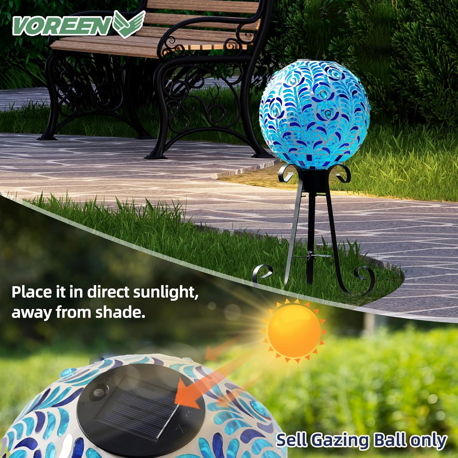VOREEN Solar Gazing Ball, 10" Mosaic Glass Gazing Globe with Solar Light, Handmade Outdoor Yard Decor Sphere for Patio Lawn Garden, Gift for Mom Wife Friend, Peacock Feather Design (Blue)