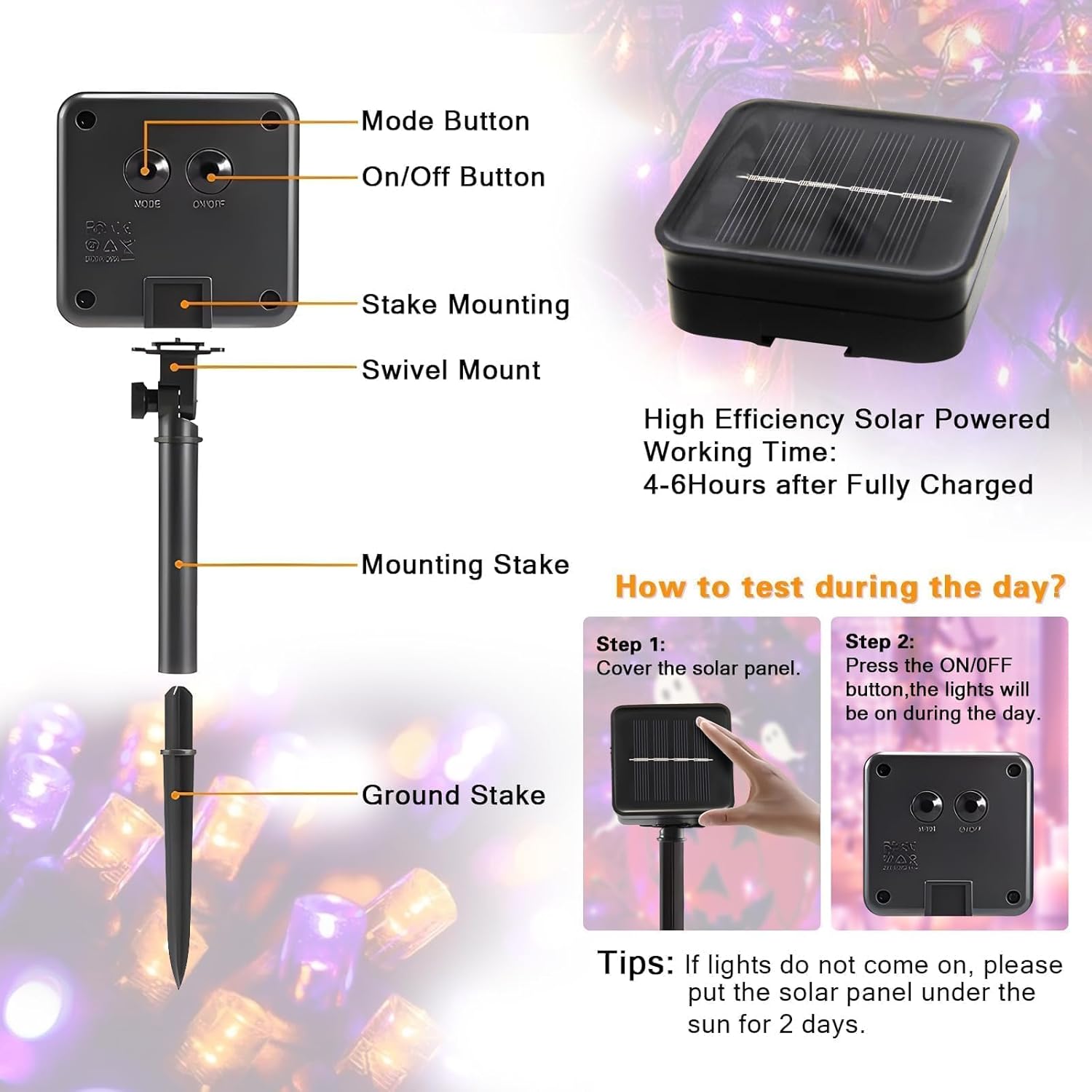 - 【Versatile Outdoor/Indoor String Lights】Solar Halloween string lights with a total of 6 strings allow you to be more flexible with your imagination and can be easily installed wherever you need to decorate. The solar lights can be molded into various shapes for gardens, patios, trees, porches, roofs, fences, bistros, restaurants, hotels, commercial buildings. It can also be used for parties, Halloween and New Year parties to create a warm and joyful holiday atmosphere.