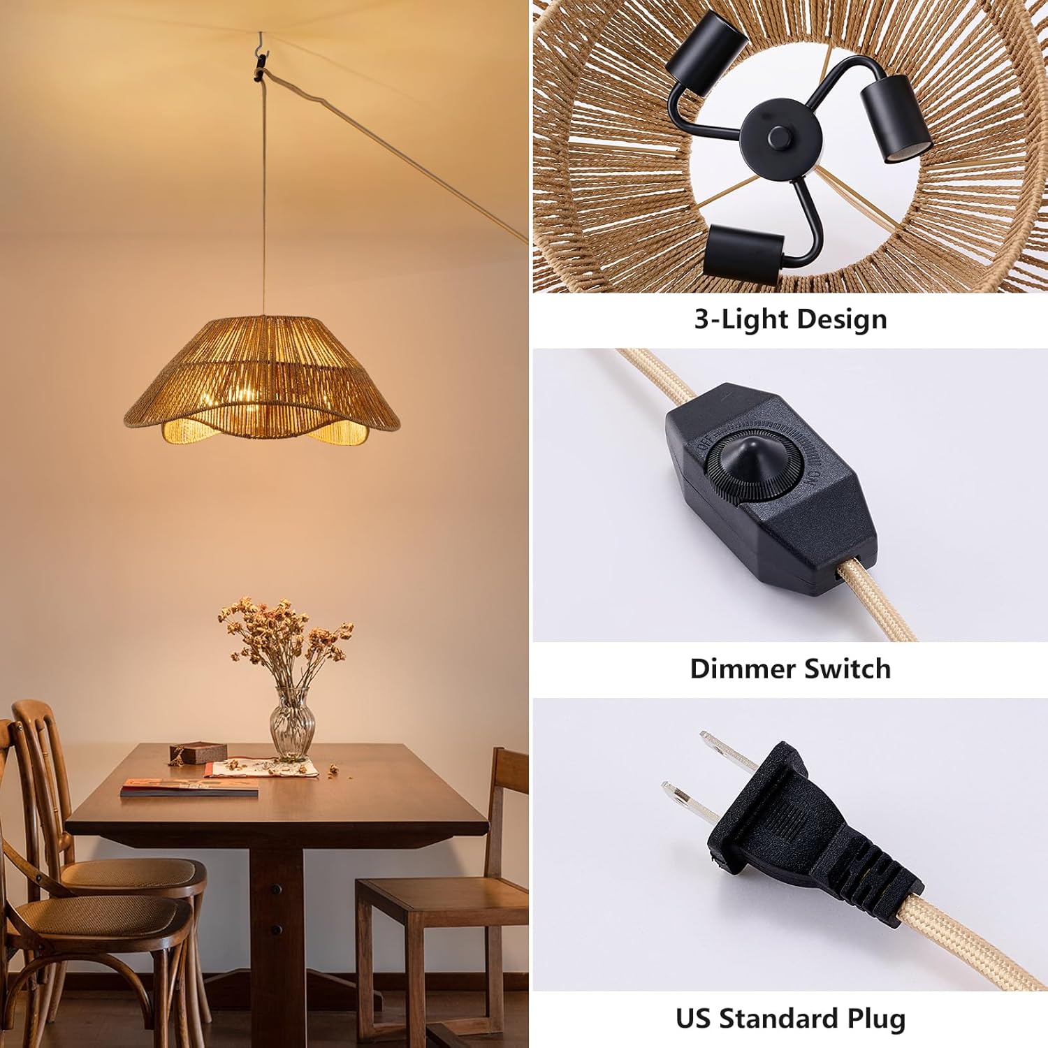 19.68" Plug in Pendant Light, 3-Light Rattan Hanging Lights with Plug in Cord, Boho Plug in Hanging Ceiling Light Fixture with Dimmable Switch, Hand Woven Wicker Hanging Lamp for Dining Room