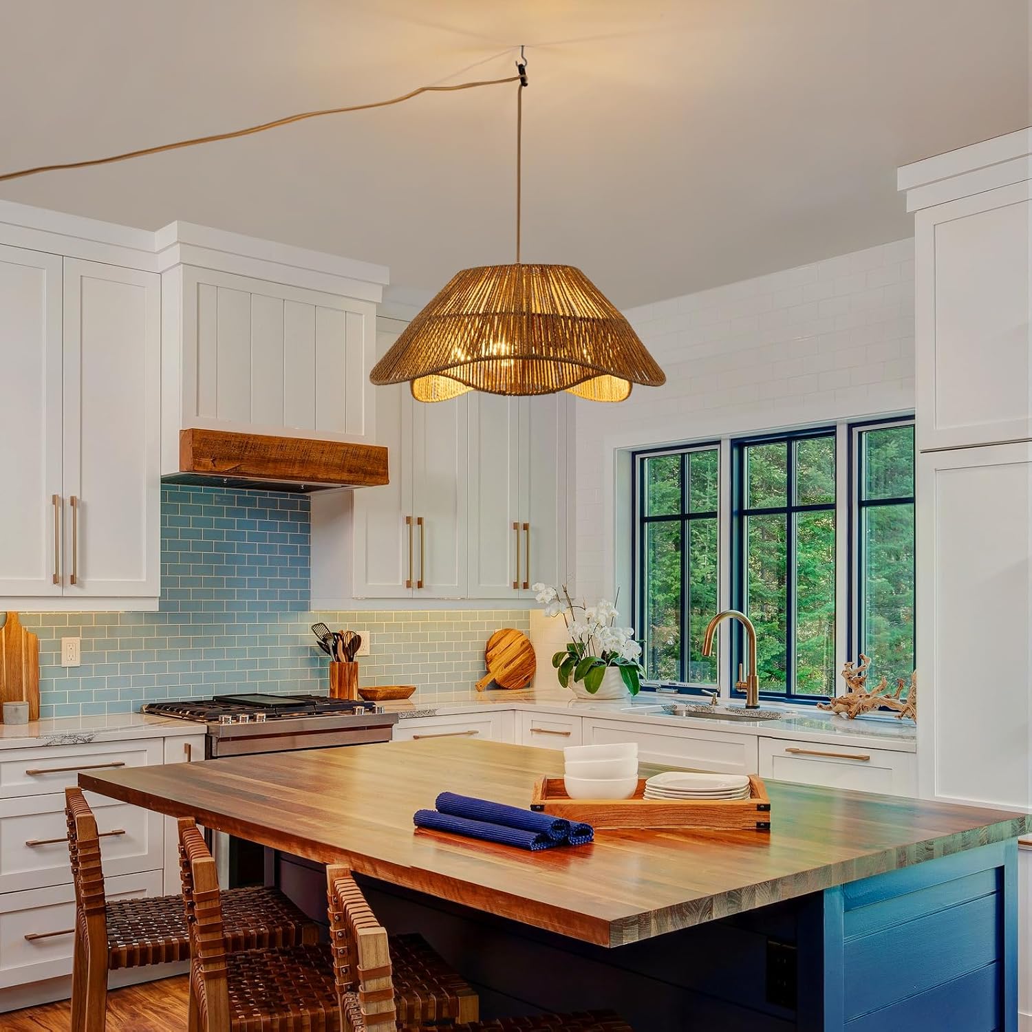 • 【Adjustable Height & Widely Used】 The rattan hanging pendant light comes with a 14.76 ft cord that makes it easy to place the light where you want it for your lighting needs. There are three bulbs inside, so it gives off plenty of light. It would be ideal in a dining room, kitchen, bedroom, living room, hallway, entryway and more.