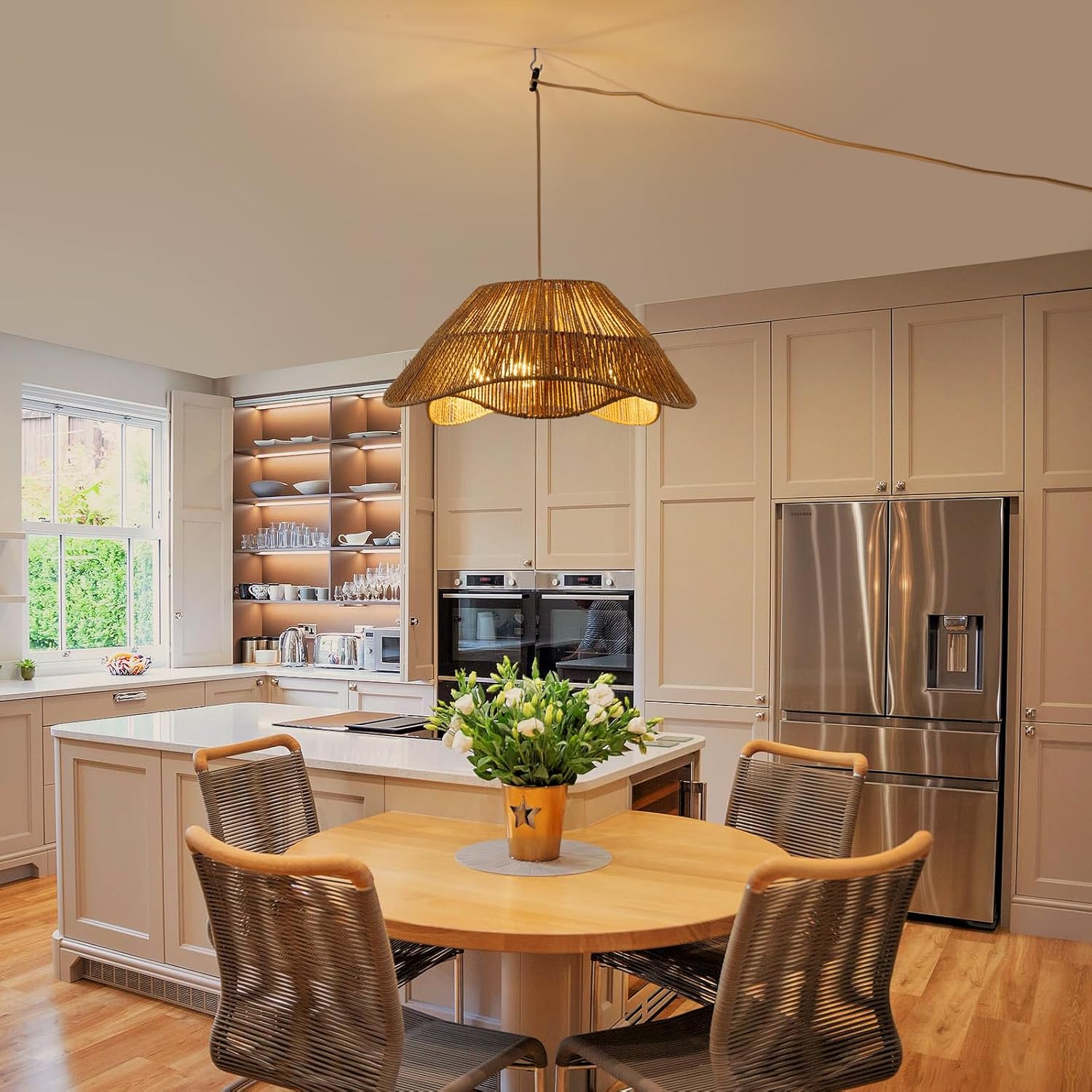 • 【Unique Design】Crafted from hand-woven natural rattan and durable metal, the plug-in pendant light blends farmhouse and boho styles to complement your indoor and outdoor decor. The double irregular rattan design diffuses light evenly and casting petal-like shadows on the ceiling, creating a warm and inviting ambiance.
