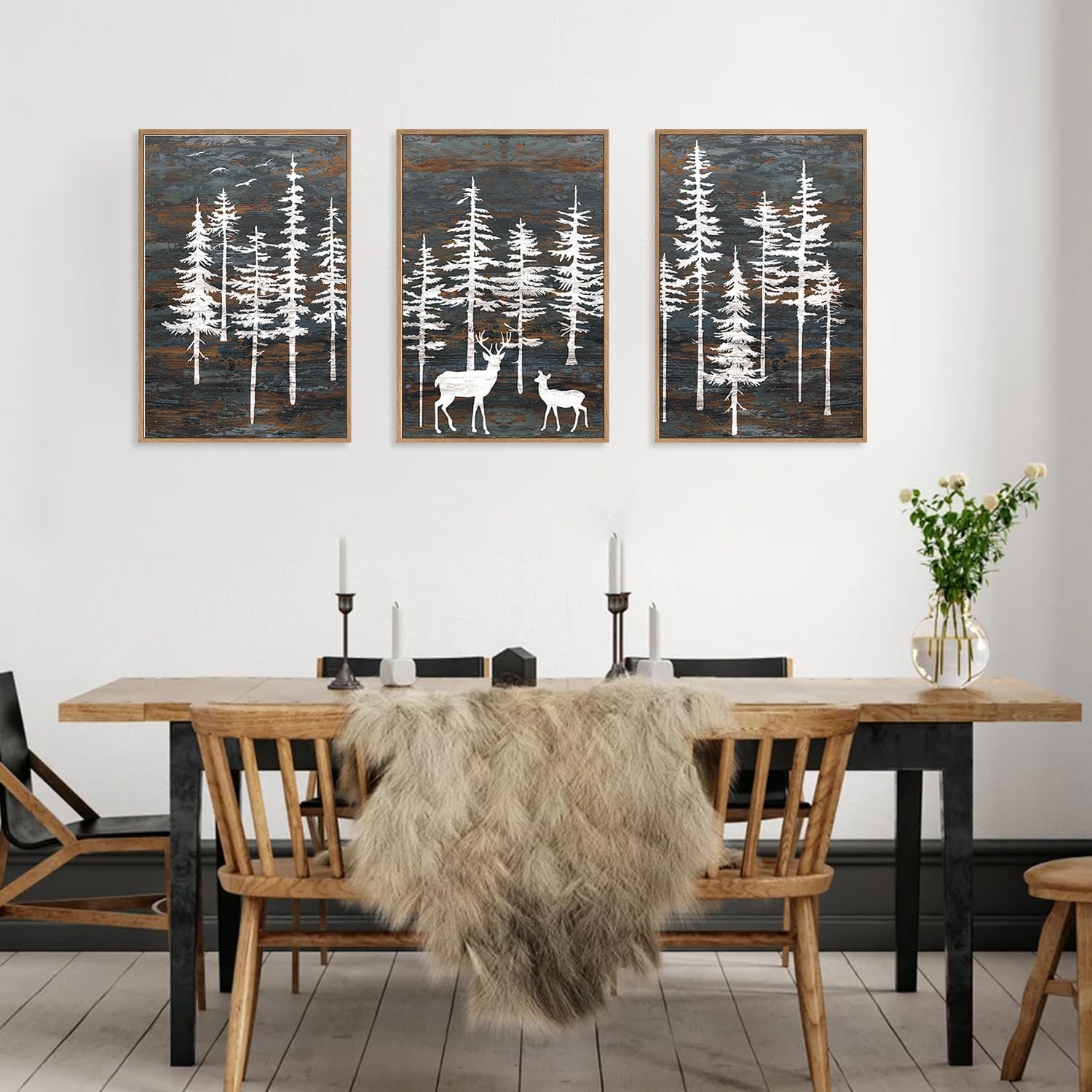 Modern White Forest Framed Canvas Wall Art Set, Minimalist Woodland Art Painting, Retro Tree Landscape Wall Decor, Wildland Deer Artwork for Living Room, Dining Room, Office - 16"x24"x3