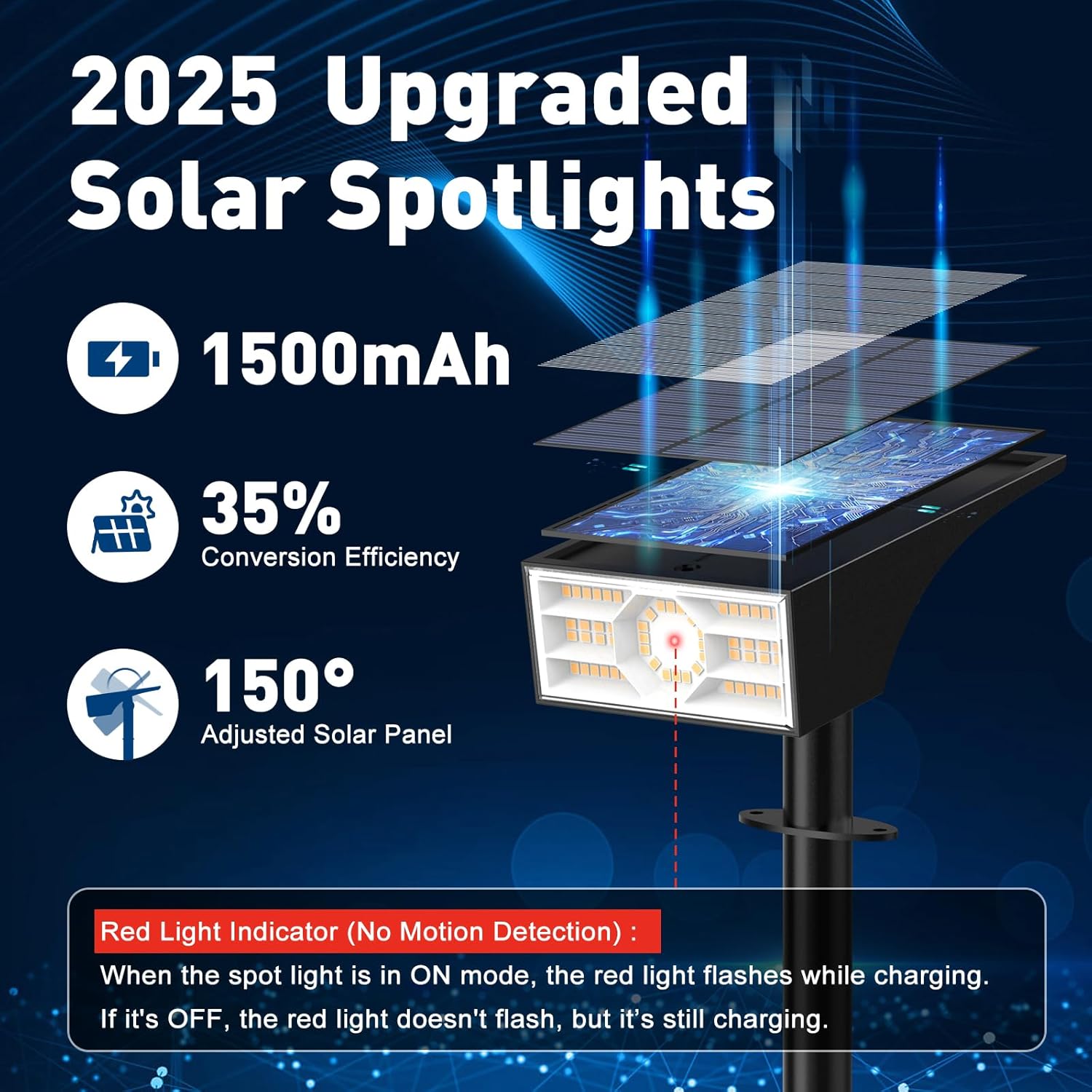 - ใ๐๐จ๐ง๐ -๐๐๐ฌ๐ญ๐ข๐ง๐ ๐๐ฅ๐ฅ๐ฎ๐ฆ๐ข๐ง๐๐ญ๐ข๐จ๐งใEquipped with 56 LEDs, our solar spotlights outdoor waterproof create the perfect lighting effect wherever they are placed. The 150ยฐadjustable head allows you to direct light exactly where you need it. Harness the power of the sun to brighten your garden without high electricity costs. With a maximum brightness of 1000 lumens, these solar spot lights provide 8-20 hours of illumination depending on charge timeโlonger, brighter, and more durable than other solar lights on the market.