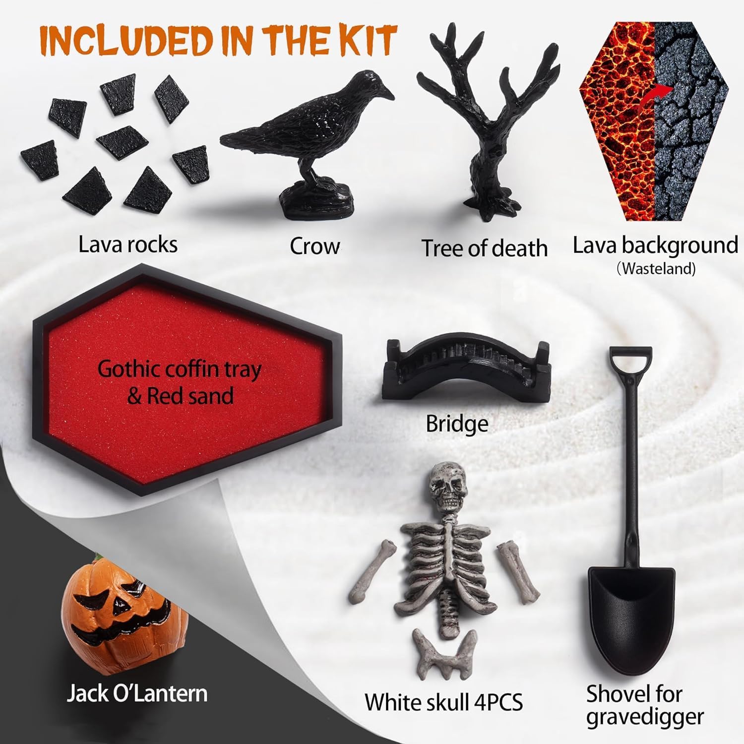- π DIY: Our Halloween Coffin Zen Garden is designed to resemble a traditional coffin.This product has 9 accessories including 1 Gothic coffin tray, 1 bridge, 1 bag of red sand, several pieces of molten rock, crows, a shovel, a dead tree, a half skeleton, and a base image of molten rock. On the special holiday of Halloween, you can place your imagined hell world, the intersection of life and death, and so on in any corner of your home to present the atmosphere of Halloween you want. Any artistic conception you want to express can be created by yourself.