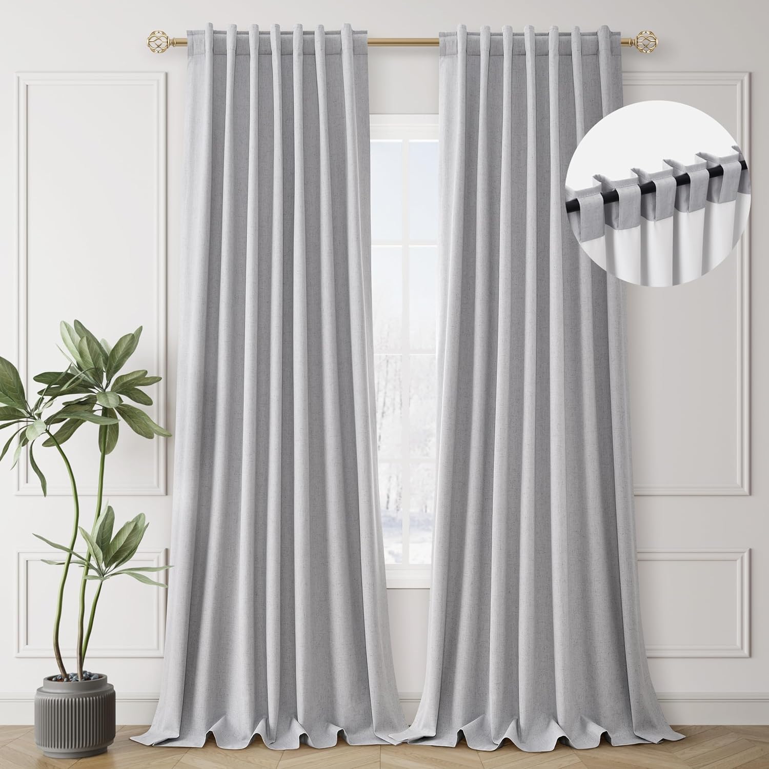Gray Thermal Insulated Linen Curtains 90 Inches Long 2 Panels Back Tab Light Grey 100% Black Out Room Darkening Window Drapes Modern Thick Blackout Curtains for Bedroom Living Room Noise Reducing