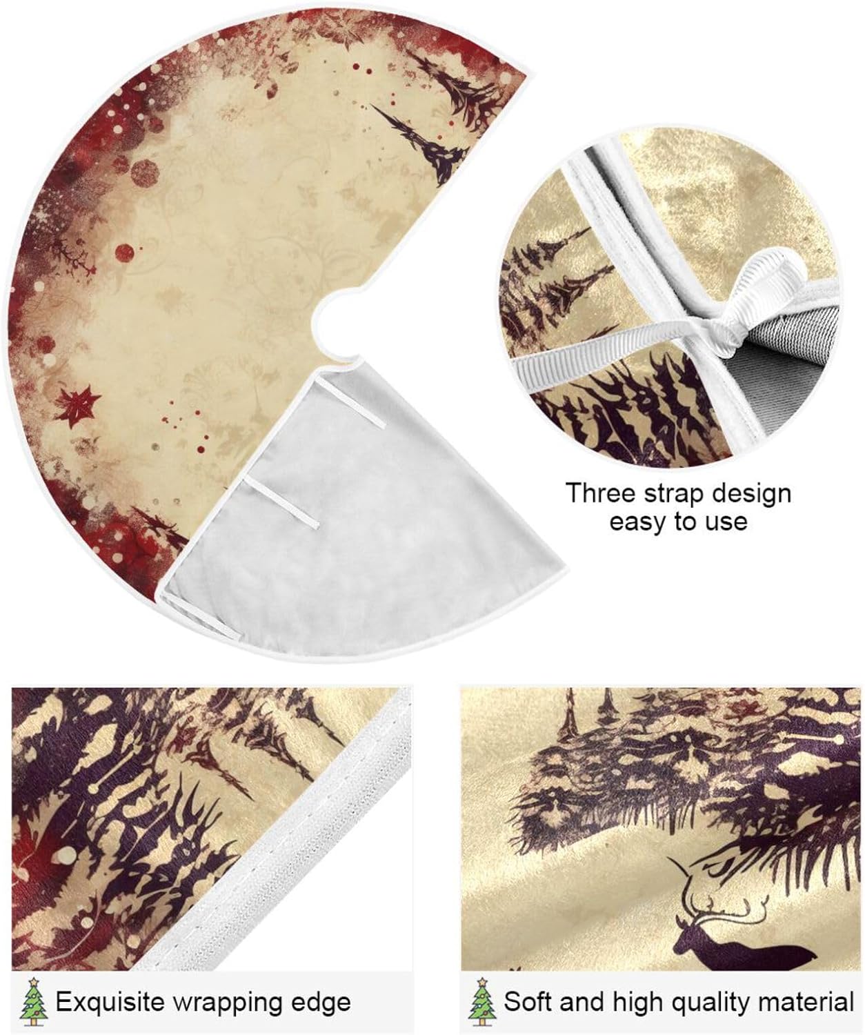 Vintage Red Elk Christmas Tree Skirt - 36 Inch Xmas Tree Mat for New Year Party Decorations