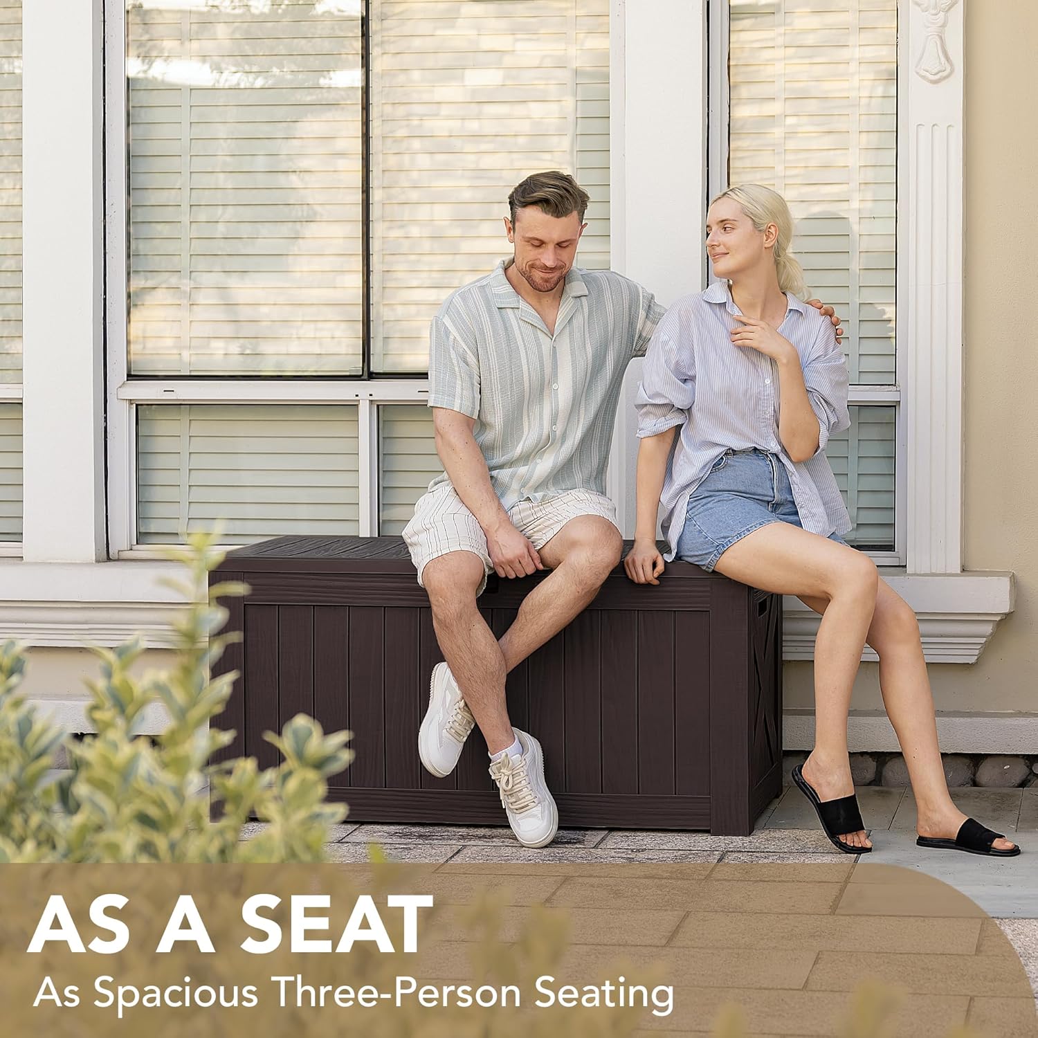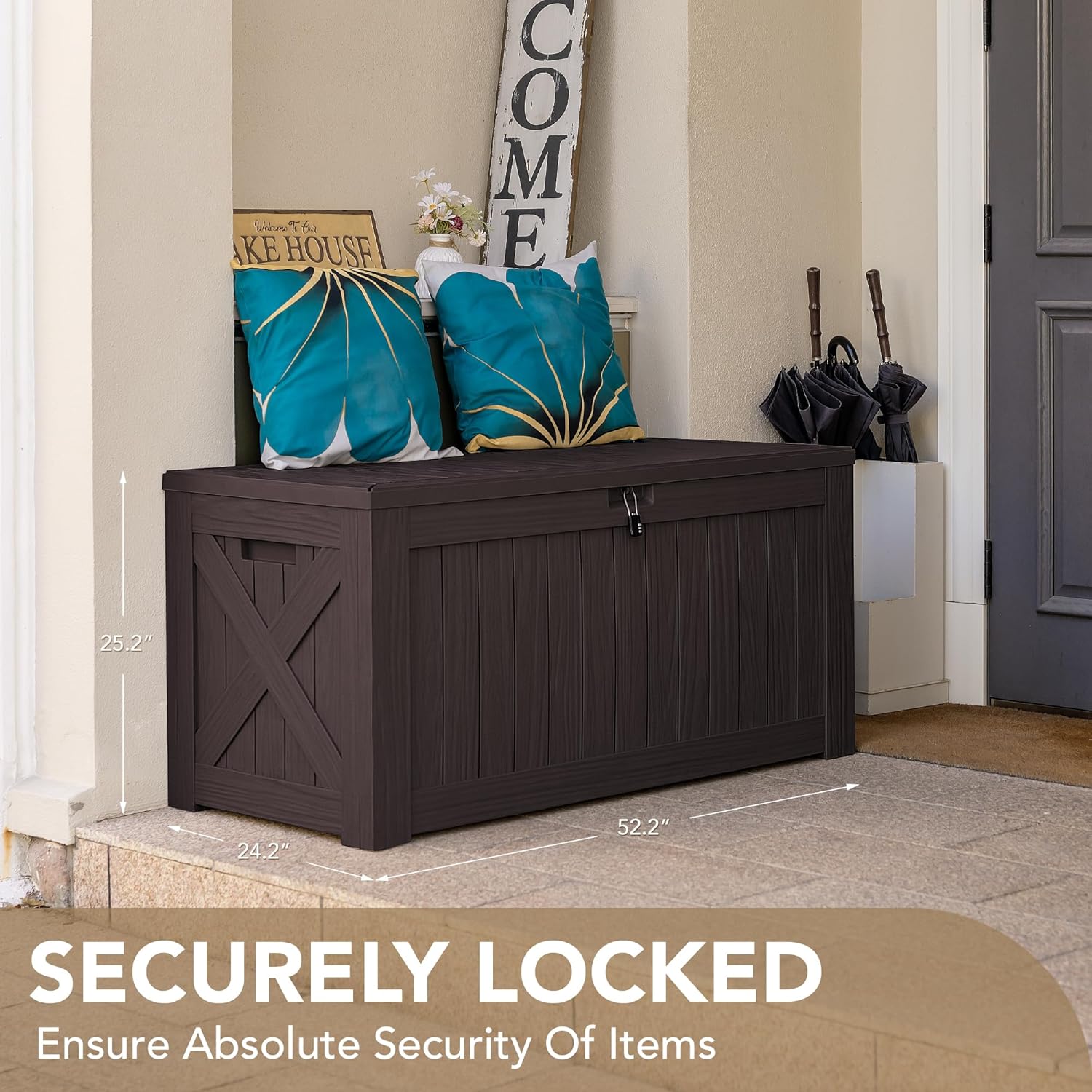 - High-quality Resin: The deck storage box is made of water-resistant resin, complemented by a wood like grain design that maintains a fresh look even with all-weather use