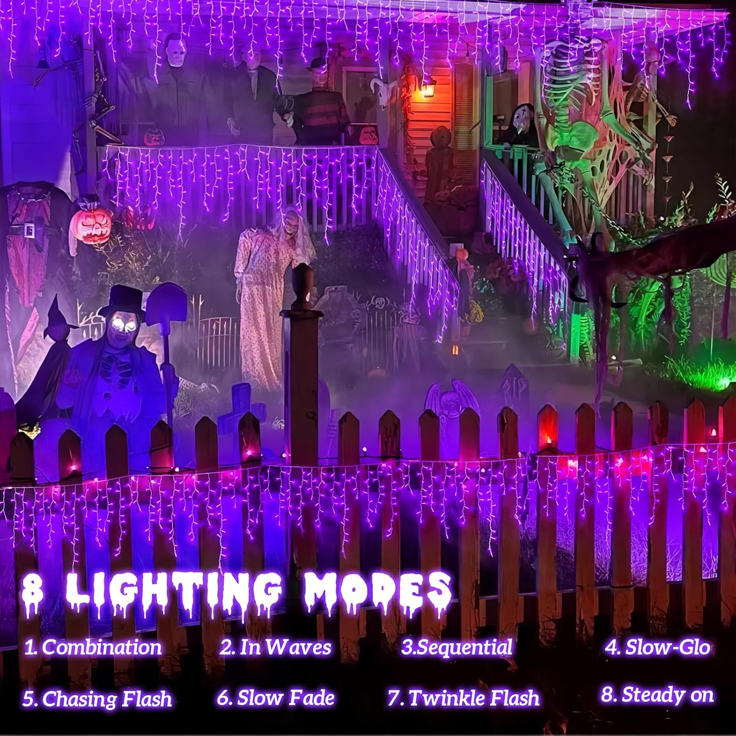 - 8 Lighting Modes: Icicle christmas lights has 8 lighting modes (combination, in wave, sequential, slo-glo, chase/flash, slow fade, twinkle/flash, steady on). Different lighting effects are controlled by the adapter button. Change the mode as needed to attract and surprise your neighbors! Purple icicle christmas lights will be a eye-catching decoration at your party.