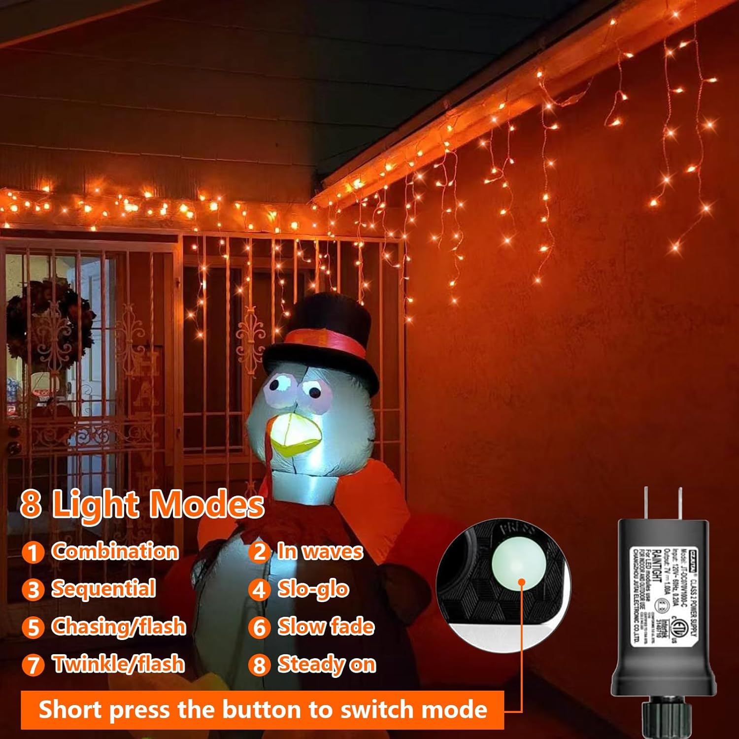 - 8 Lighting Modes: Orange Icicle lights has 8 lighting modes (combination, in wave, sequential, slo-glo, chase/flash, slow fade, twinkle/flash, steady on). Different lighting effects are controlled by the adapter button. Change the mode as needed to attract and surprise your neighbors! Orange Icicle lights will be the best decoration for creating a terrifying atmosphere during Halloween