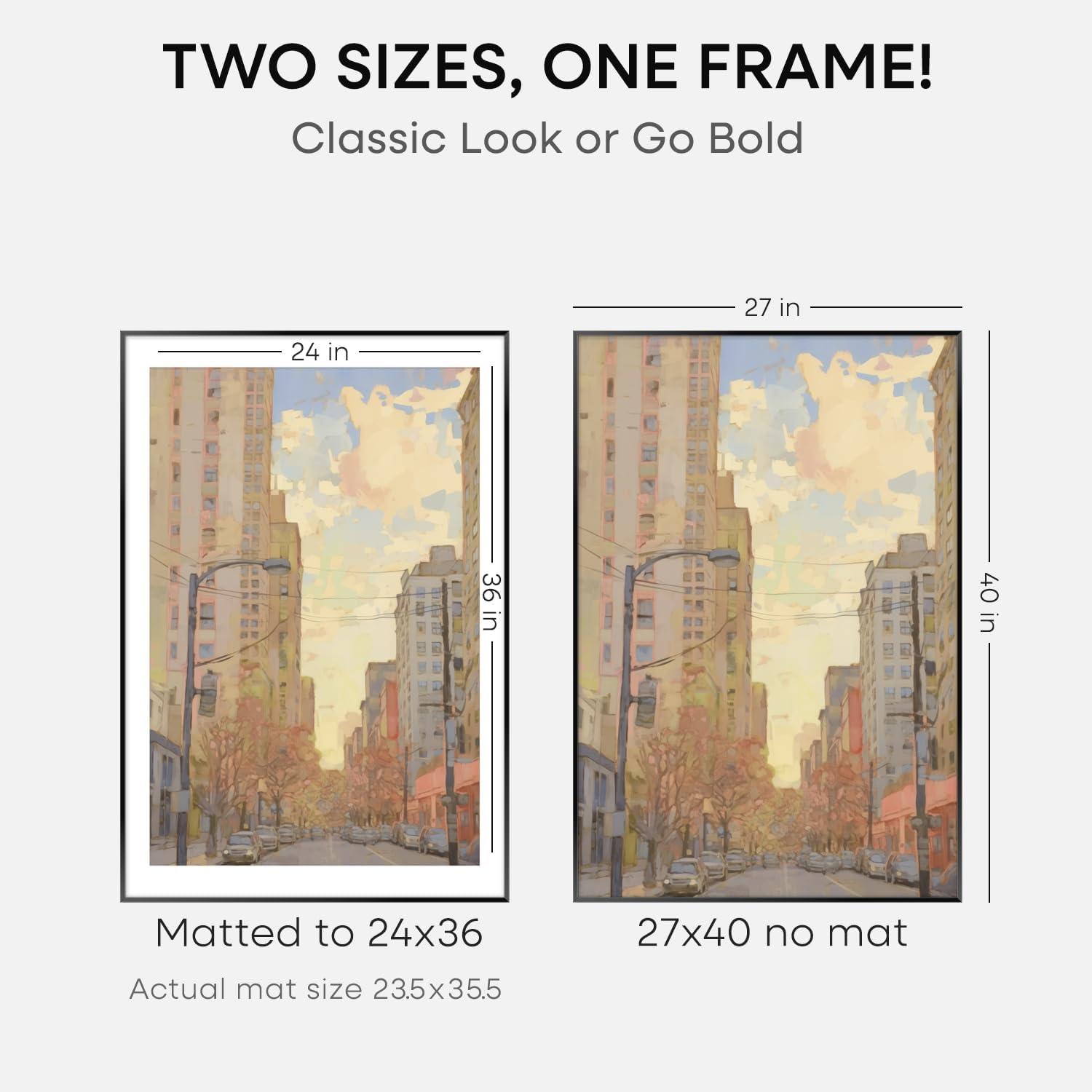 • MATTED OR EDGE-TO-EDGE—YOUR CALL. A crisp 24x36 white mat creates negative space, elevating your image with gallery precision. Or remove it for 27x40 bold, uninterrupted impact.