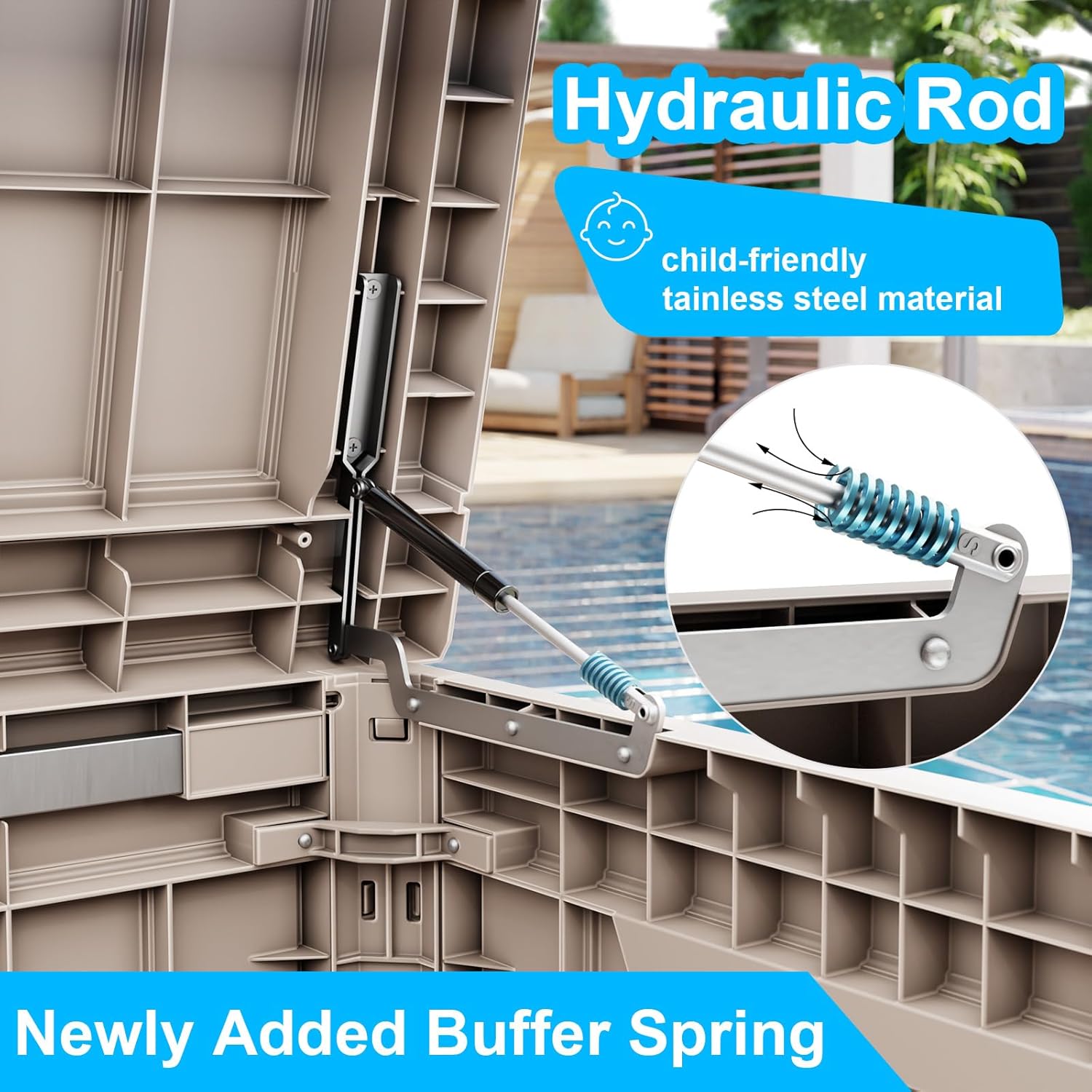 • Safety design: Each deck box has lockable holes (not included) for added security; in addition, the box is equipped with a hydraulic stand, which allows easy opening and slow closing and prevents hand pinching. The outdoor waterproof deck box has built-in handles on both sides, ensuring easy grabbing and moving