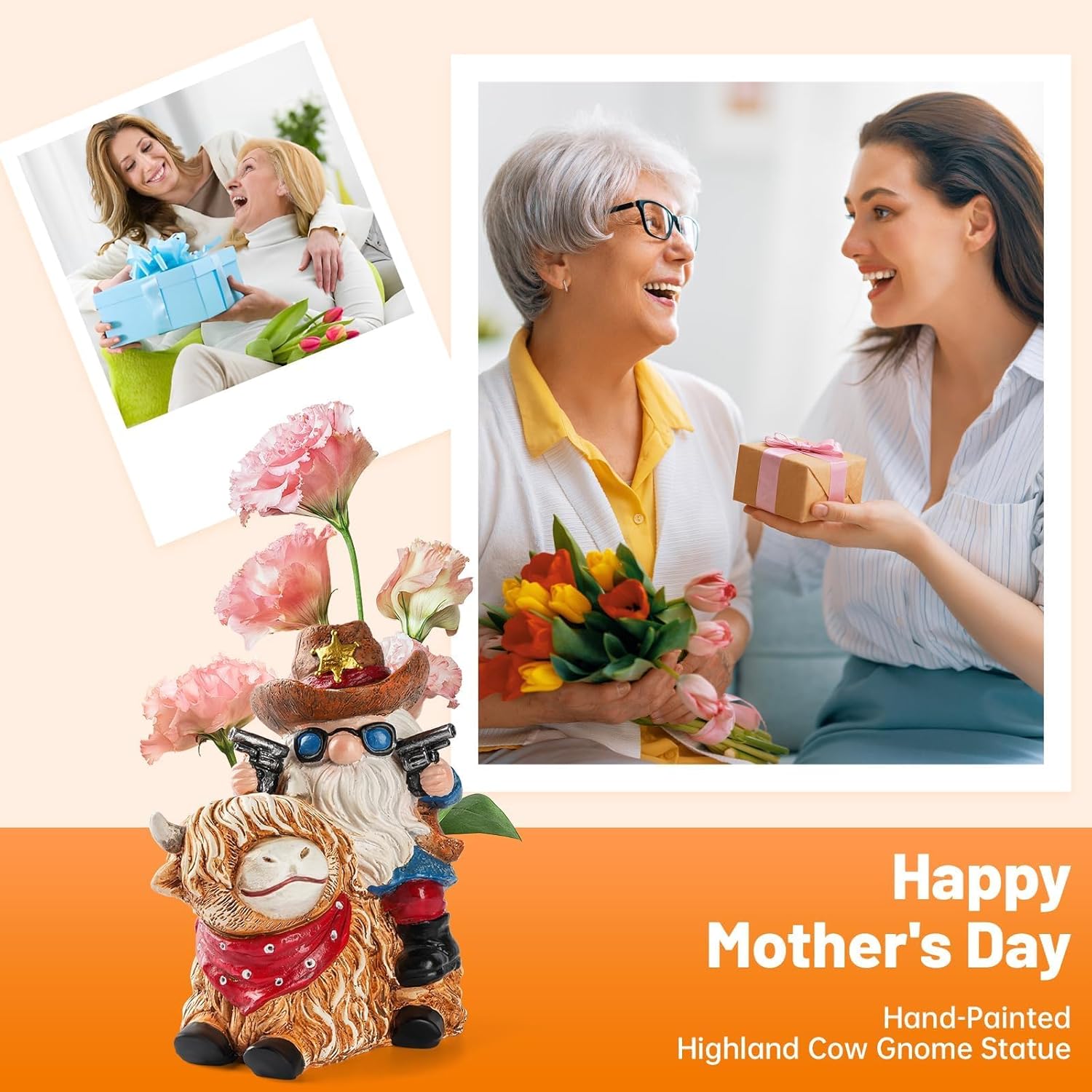 Solar Highland Cow Gnome Statue - Hand-Painted Resin Outdoor Decor for Garden & Yard, Unique Mothers Day Birthday Gifts for Grandma Women (Weatherproof)