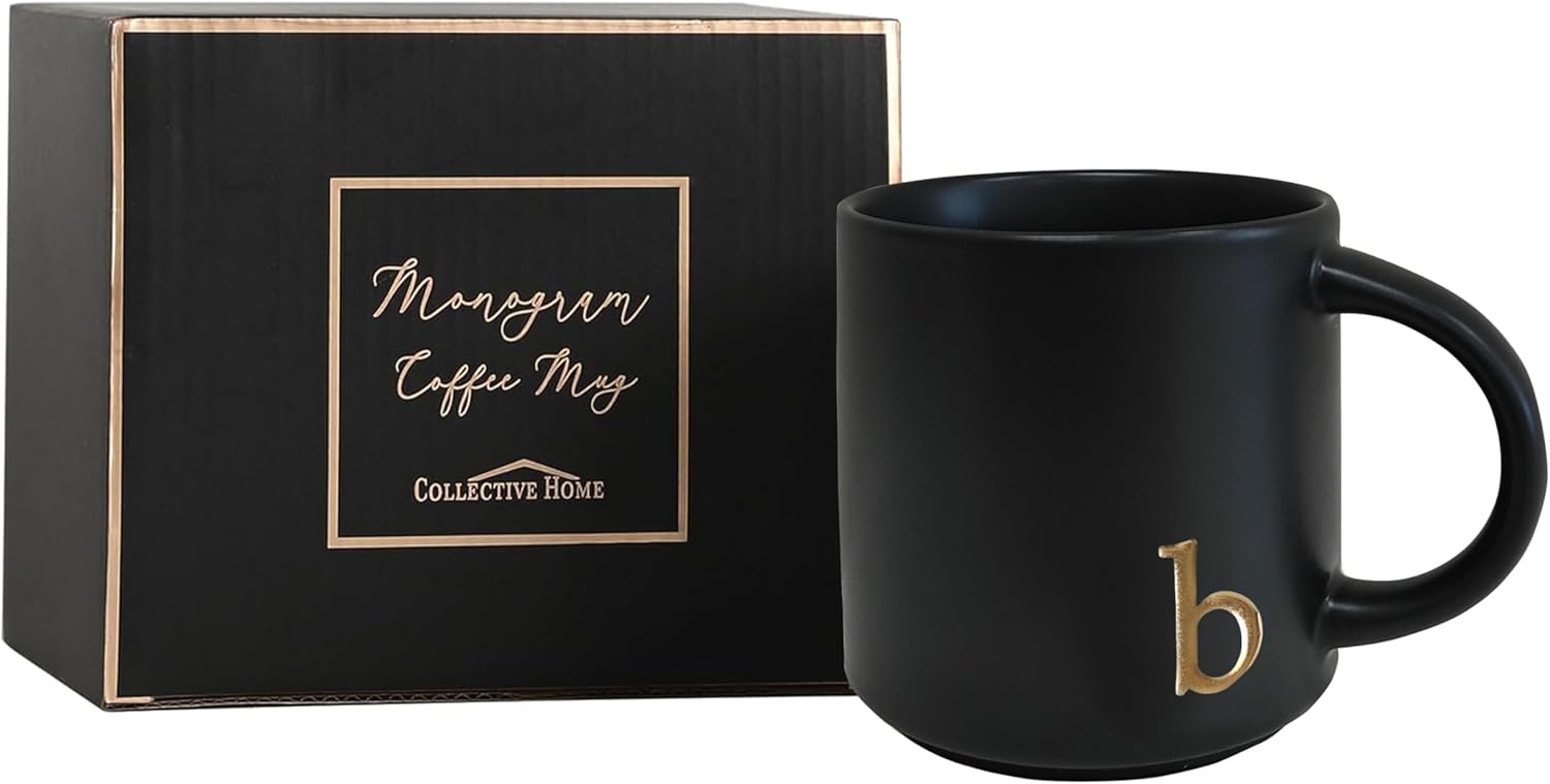 COLLECTIVE HOME - Black Monogram Ceramic Mugs, 15 oz Golden Initial Coffee Cups, Elegant Alphabet Tea Mugs, Personalized Halloween Mug with Gift Box, Perfect for Office and Home Décor (b)