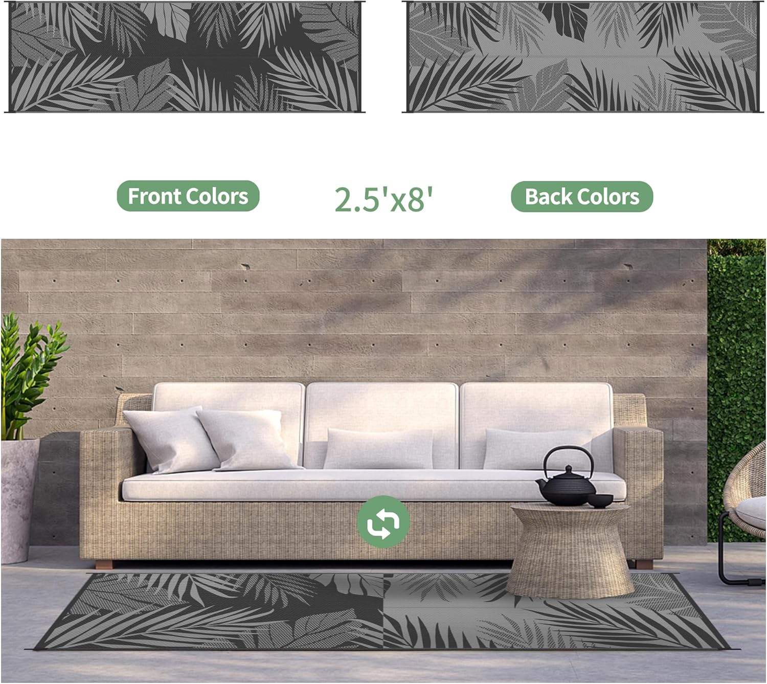 - Palm Leaf Design & Double-Sided Pattern: GENIMO reversible fall outdoor rug is designed with a double-sided pattern, completing the unique layout of multiple palm leaves. The 2 shades of black and grey achieve the ultimate fusion. Either side can blend perfectly with nature and look very full and comfortable, making it a versatile piece for fall decor