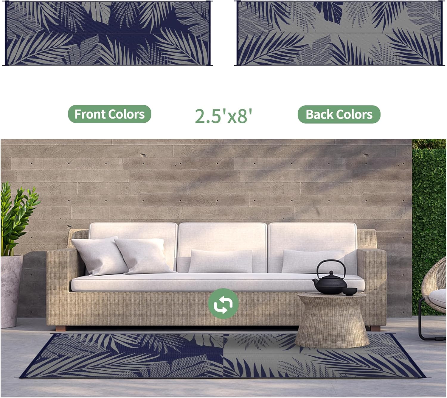 GENIMO Outdoor Rug 2.5' x 8' Waterproof for Patios Clearance, Reversible Outdoor Plastic Straw Camping Rug Carpet, Large Area Rugs Mats for RV, Camper, Deck, Balcony, Porch, Beach, Picnic, Blue&Grey