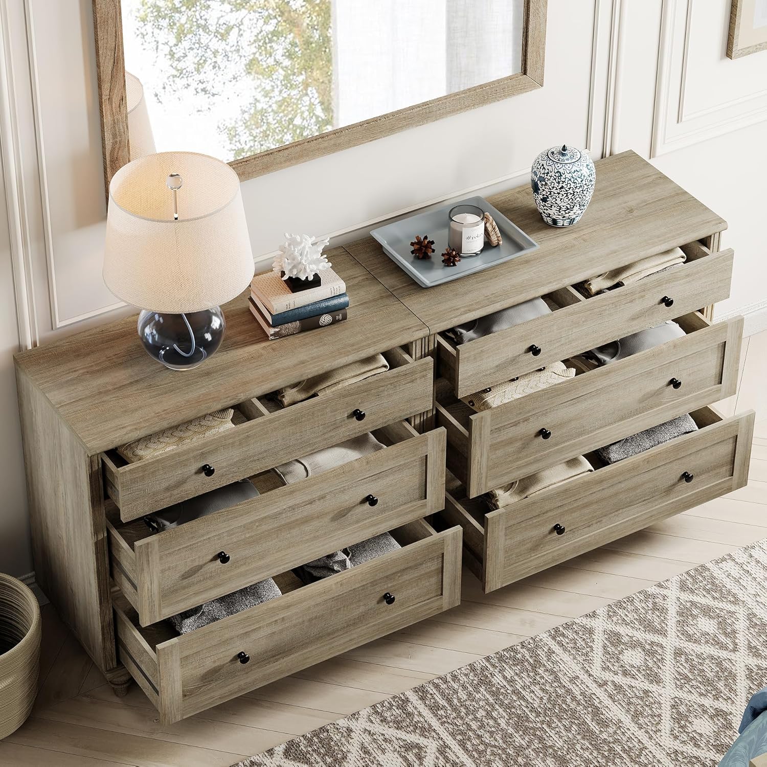 - ă2-in-1 Multipurpose DresserăThe 2-in-1 large dresser can be used together as 6 drawer dresser or tv stand for 75 inch tv, or used separately as two 3 drawer dressers.With distresser suface is very classic and elegant which blends in easily with any decor. It is ideal as a baby dresser, kids dresser and console table, etc.