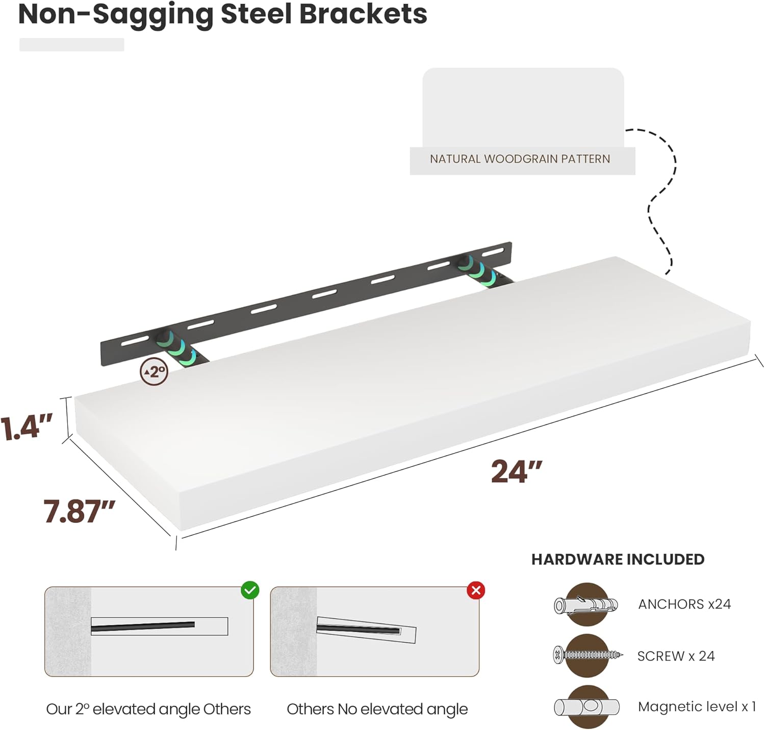Floating Wood Shelves for Wall 24 Inches x 8”x 1.4” Shelf Floating Home Decor, Heavy Duty Shelf Hold 60 lbs, Wall Shelves for Bathroom Living Room Kitchen Bedroom Office - Set of 2 White