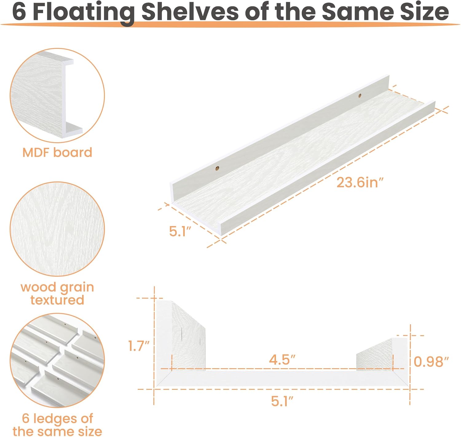 upsimples Floating Shelves for Wall, Wall Shelves for Decor Storage Set of 6, Wall Mounted Wood Shelf for Bedroom, Living Room, Bathroom, Kitchen, 23.6 inch Long Picture Ledge Shelf, White