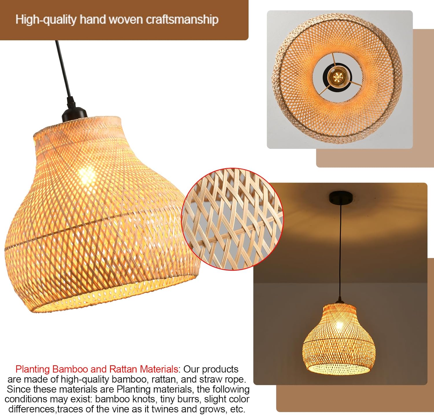 - 1. Natural Materials Our products are made of high-quality bamboo, rattan, and straw rope Since these materials are natural materials, the following conditions may exist: bamboo knots, tiny burrs, slight color differences, micro scars, etc During the use of lamps, the color will change slightly over time, which is a natural change