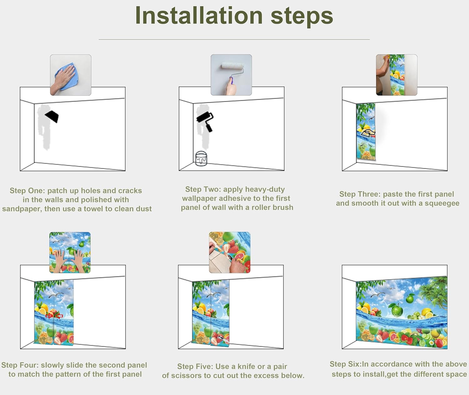 - INSTALLATION - 1.Fill in all cracks or holes and clean dust dirt and grease on the wall surface. 2. Apply the heavy duty wallpaper paste on the wall not mural. 3. Use a spirit level to mark first strip location. 4. match the pattern by sliding into place. 5.use a scraper to smooth out bubbles press. 6. Let dry for a few minutes and that's it! Please Note: Not self-adhesive. We recommend to use a standardized fleece wallpaper paste.