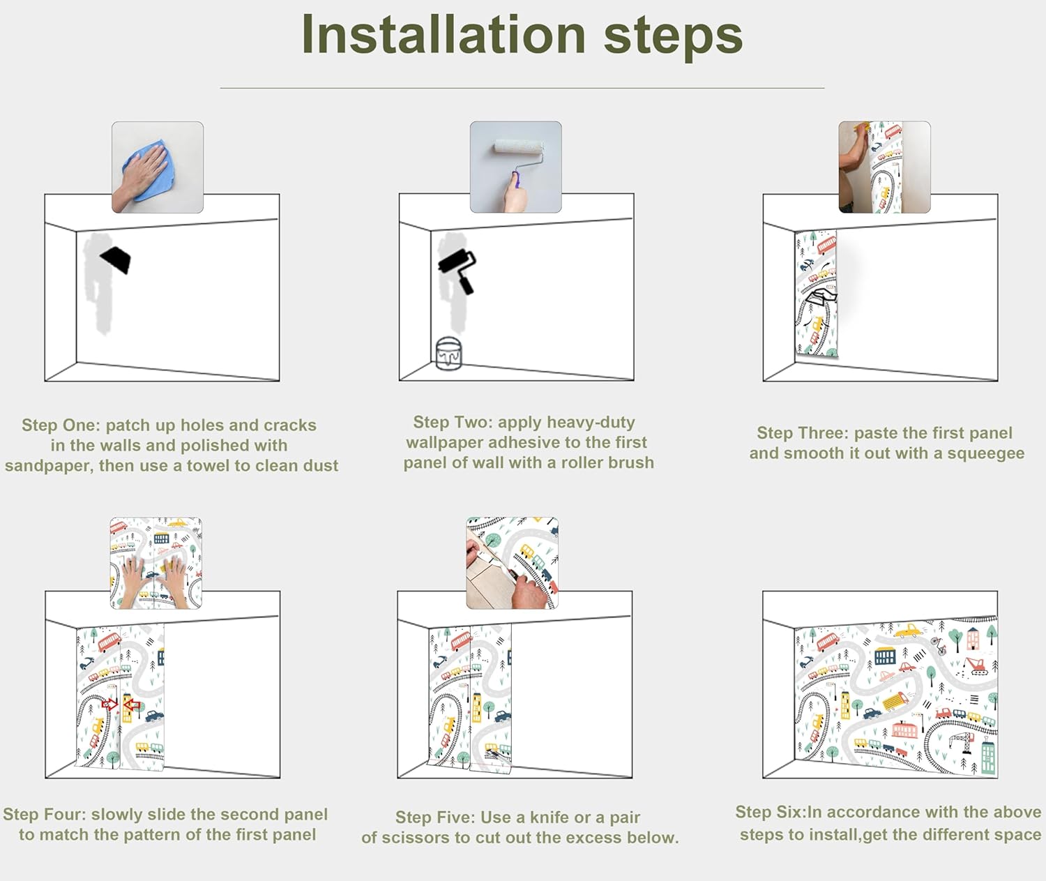 - INSTALLATION - 1.Fill in all cracks or holes and clean dust dirt and grease on the wall surface. 2. Apply the heavy duty wallpaper paste on the wall not mural. 3. Use a spirit level to mark first strip location. 4. match the pattern by sliding into place. 5.use a scraper to smooth out bubbles press. 6. Let dry for a few minutes and that's it! Please Note: Not self-adhesive. We recommend to use a standardized fleece wallpaper paste.