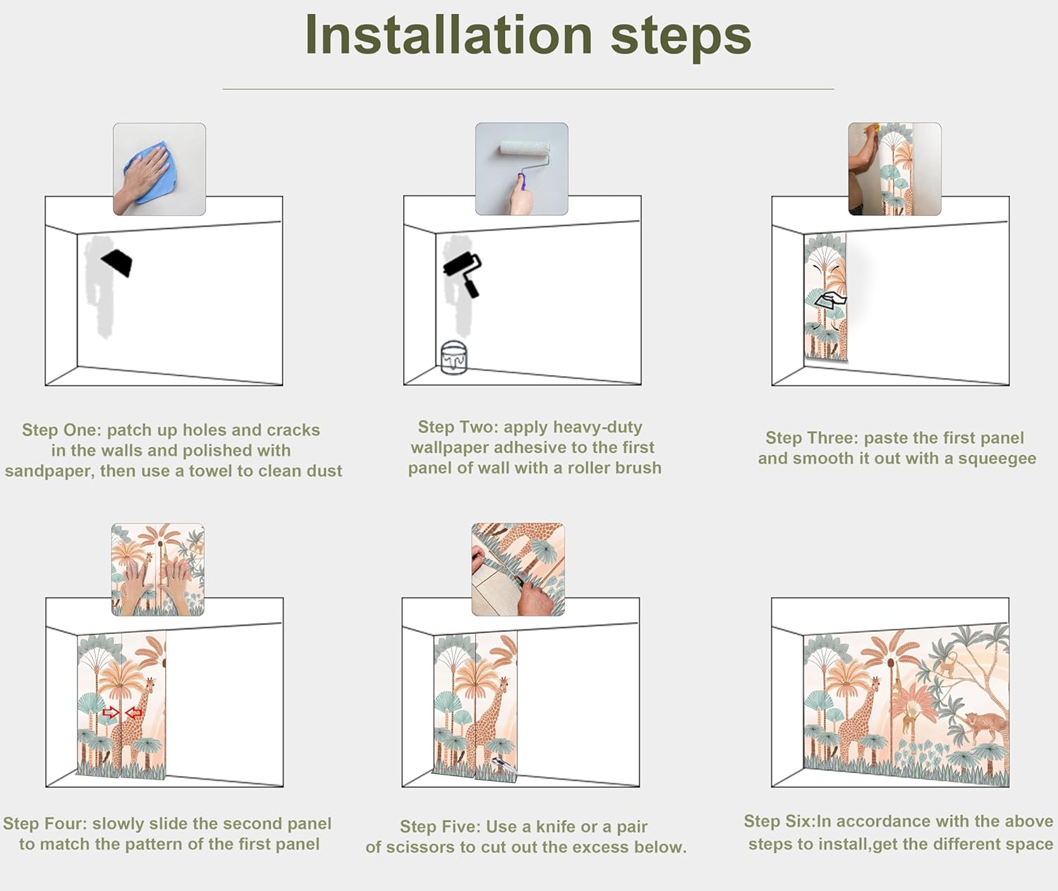 - INSTALLATION - 1.Fill in all cracks or holes and clean dust dirt and grease on the wall surface. 2. Apply the heavy duty wallpaper paste on the wall not mural. 3. Use a spirit level to mark first strip location. 4. match the pattern by sliding into place. 5.use a scraper to smooth out bubbles press. 6. Let dry for a few minutes and that's it! Please Note: Not self-adhesive. We recommend to use a standardized fleece wallpaper paste.
