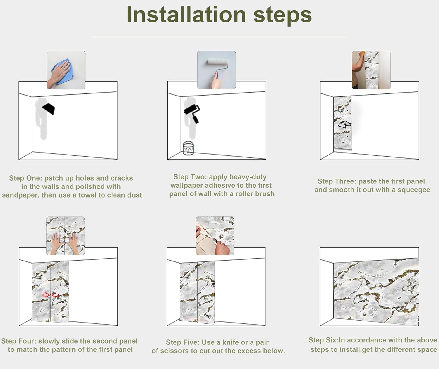 - INSTALLATION - 1.Fill in all cracks or holes and clean dust dirt and grease on the wall surface. 2. Apply the heavy duty wallpaper paste on the wall not mural. 3. Use a spirit level to mark first strip location. 4. match the pattern by sliding into place. 5.use a scraper to smooth out bubbles press. 6. Let dry for a few minutes and that's it! Please Note: Not self-adhesive. We recommend to use a standardized fleece wallpaper paste.