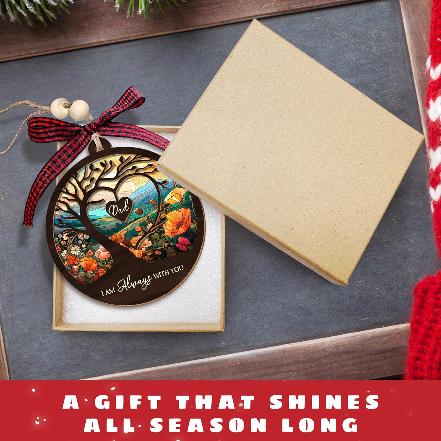 - ORNAMENT SET INCLUDES: You will receive 1x Wood & Acrylic Ornament, 1x Twine Rope Ribbon, and 1x Kraft Gift Box. This twine rope also features two wooden beads and a caro red ribbon. The included instruction sheet will show step-by-step how to tie the rope with your ornament. By following these instructions, you'll able to create a unique and rustic look for your Christmas tree.