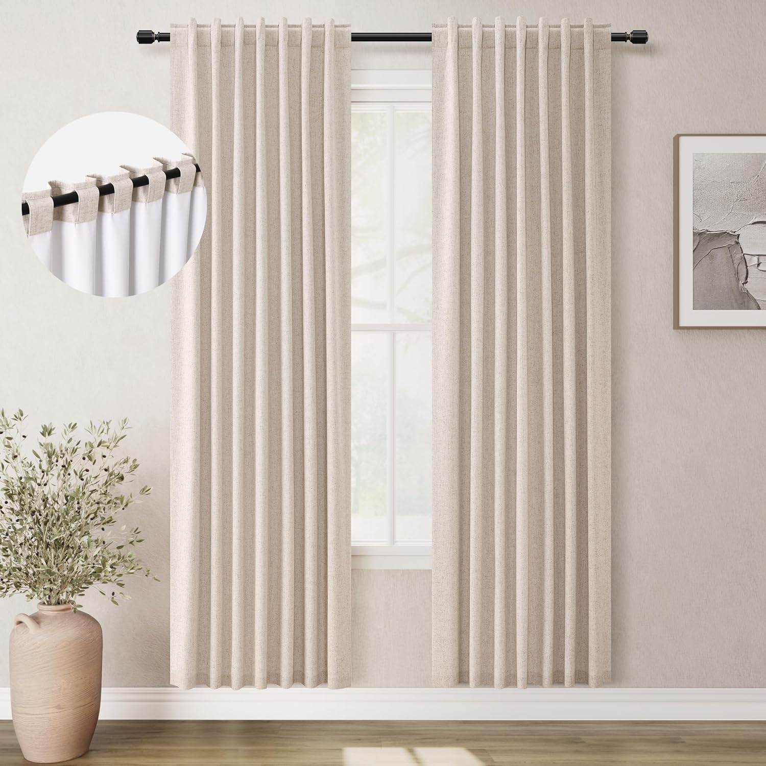 - 3 Hanging Options: Differ from the traditional curtains with grommet, BOODII linen curtains with back tab and rod pocket can full block sunlight fully. (1) Using the back tabs design to create an elegant pleated look and sit closer to the wall than traditional ring curtains, which helps to block out more sunlight; (2) Using rod pocket for a classic effect; (3) Using clip rings on track system or curtain rod, slide open/closed easily (clip rings are not included).