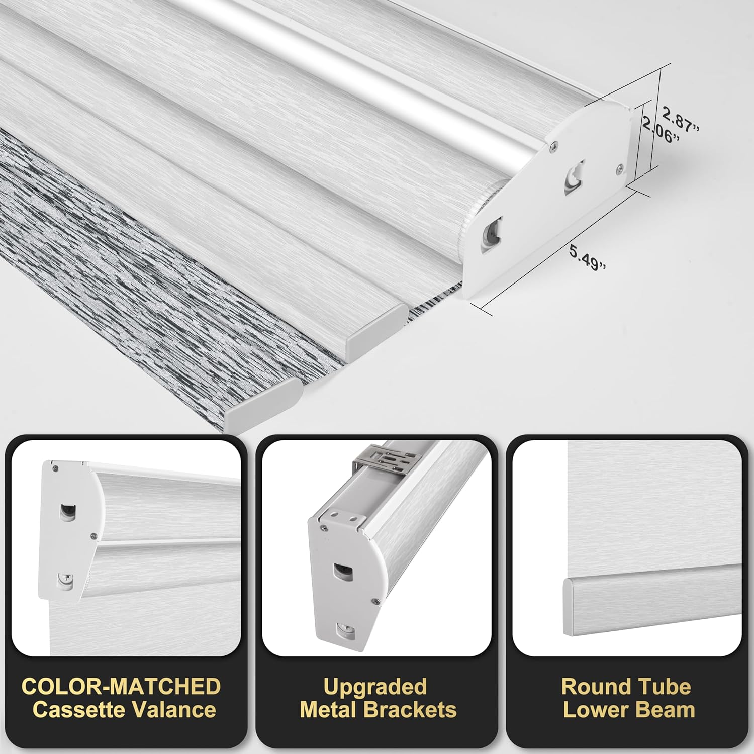 - FREE STOP CORDLESS SYSTEM:The cordless double roller shade prioritizes safety with a cordless design designed for families with small children or pets.You just need to pull down or push up to stop at any position you want. COLOR-MATCHED CASSETTE VALANCE:The hidden installation of the cordless roller blinds can effectively reduce installation gaps, reduce light leakage.The color of the cassette valance is same as the fabric color,making the day night blinds more beautiful after installation.
