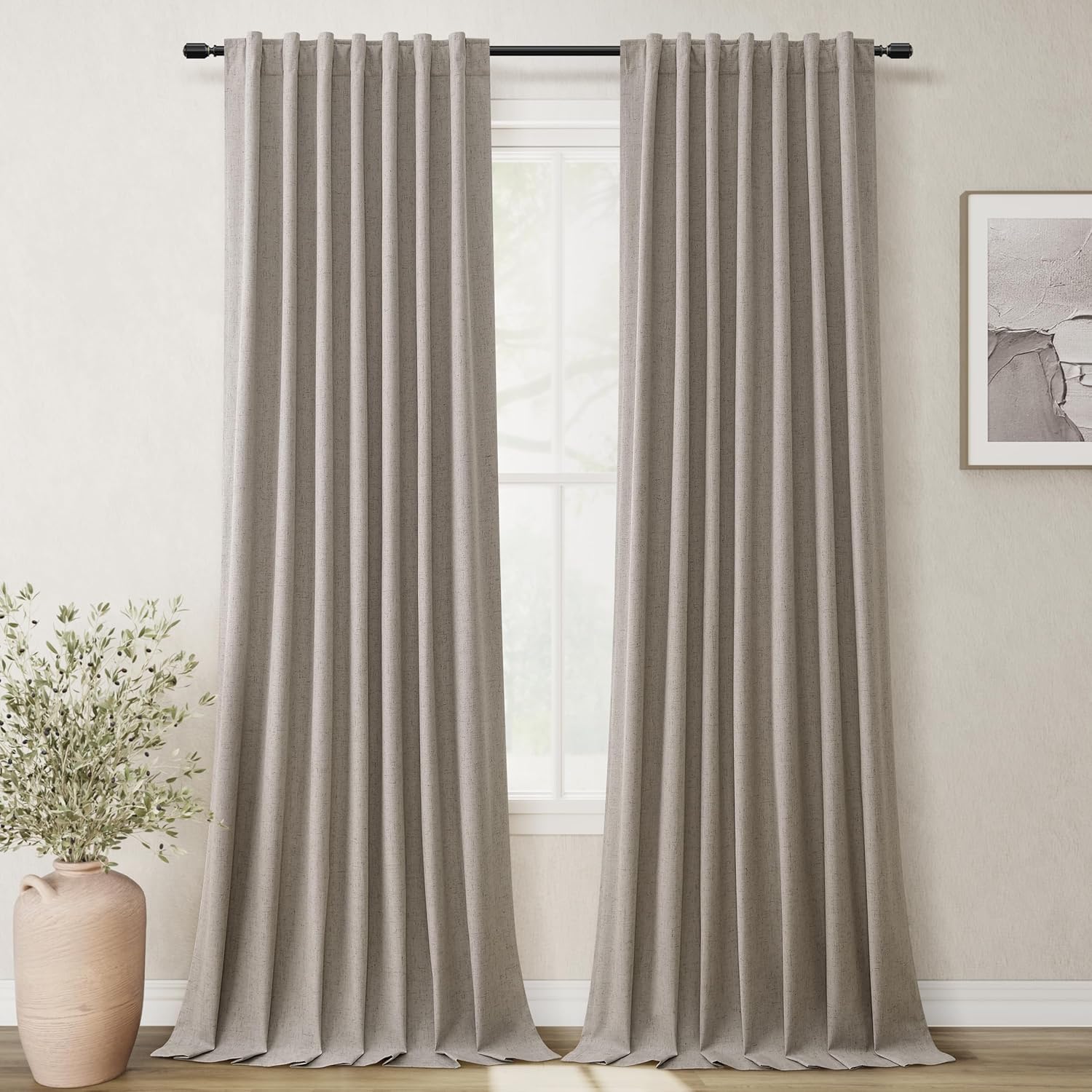 - 3 Hanging Options: Differ from the traditional curtains with grommet, BOODII linen curtains with back tab and rod pocket can full block sunlight fully. (1) Using the back tabs design to create an elegant pleated look and sit closer to the wall than traditional ring curtains, which helps to block out more sunlight; (2) Using rod pocket for a classic effect; (3) Using clip rings on track system or curtain rod, slide open/closed easily (clip rings are not included).