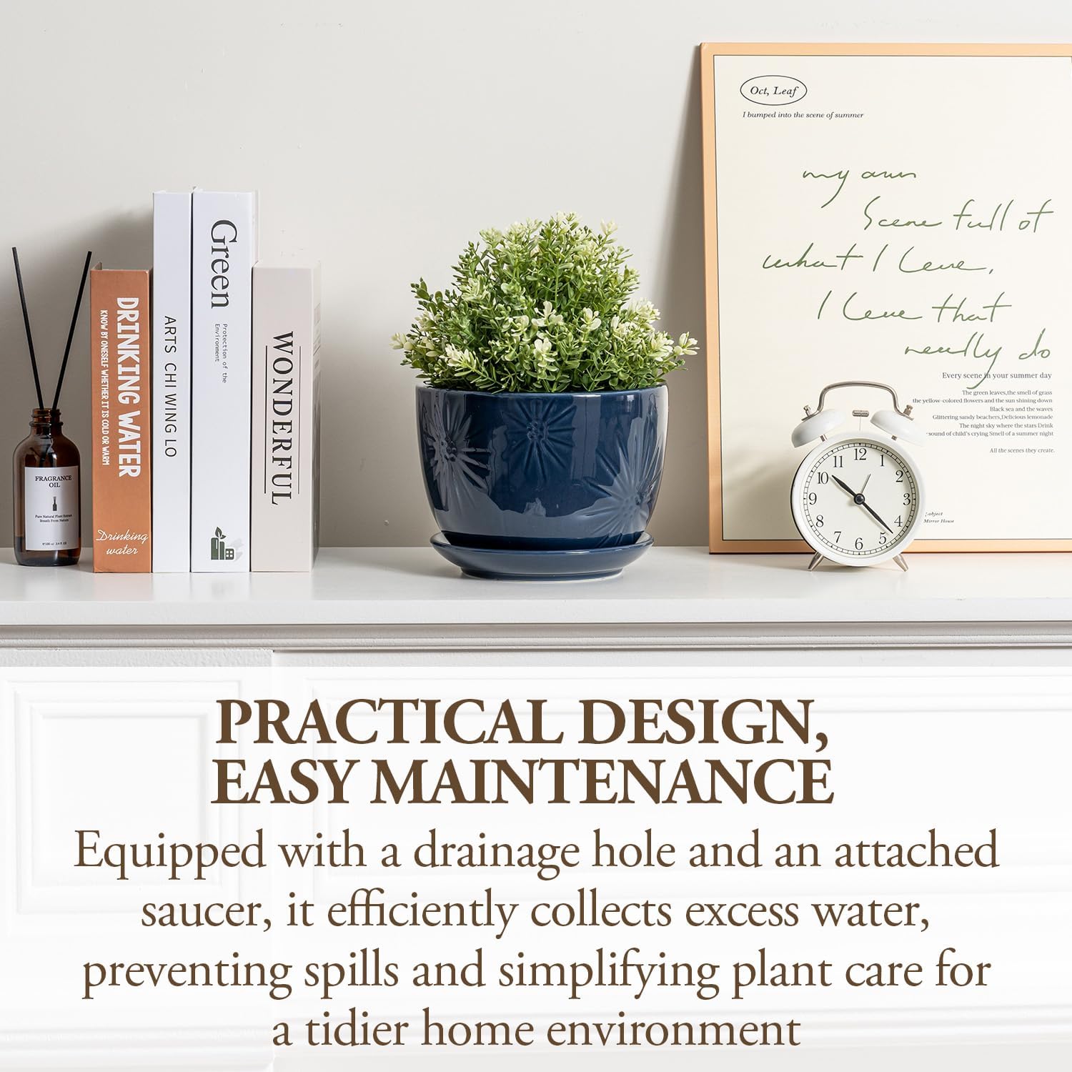 - Featuring an attached saucer to catch excess water and protect the indoor surfaces of desks, tables, and shelves, or outdoor spaces like windowsills, porches, and patio furniture
