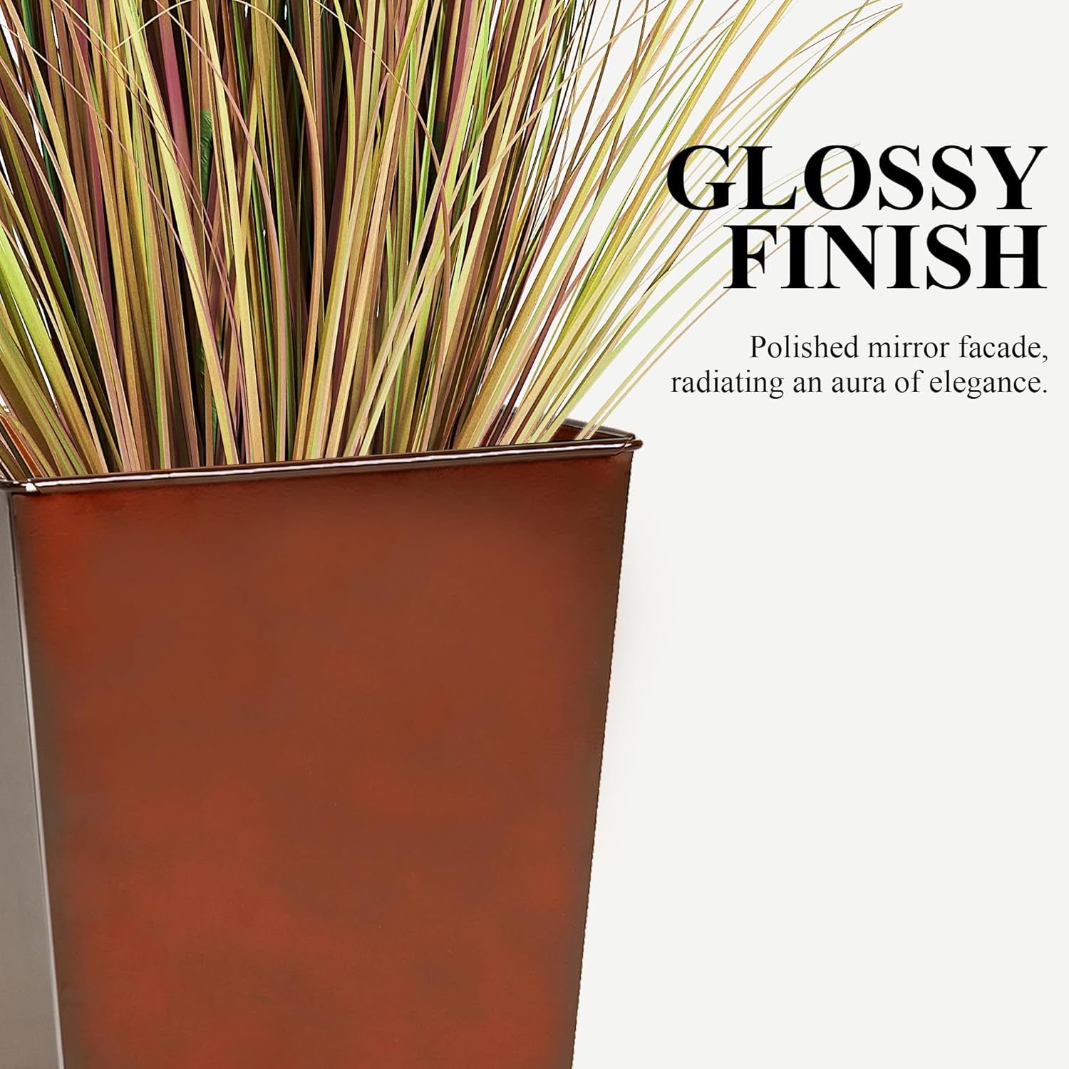 WORTH Garden 28" Large Metal Glazed Planter Set of 2, Luxurious Glossy Finish Red Tall Square Tapered Steel Plant Pots, Decor Flower Pot Indoor & Outdoor, Drainage Hole & Dual-Purpose Plant Saucer