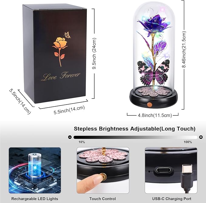 - Mothers Day Gifts for Mom: Glass Rose with Butterfly and Heart Crystals Base: Plated with a 3" extra-large rainbow galaxy rose, one unique butterfly, and 4 shiny Heart-shaped crystal on a black plastic base. The glass rose is wrapped around an LED Strip tree lamp, Powered by a built-in rechargeable battery, no need for battery replacement. Simply touch the gold button on the base, and it will glow warm light that can make your mom, wife or grandma's heart feel pleasure on Mothers Day