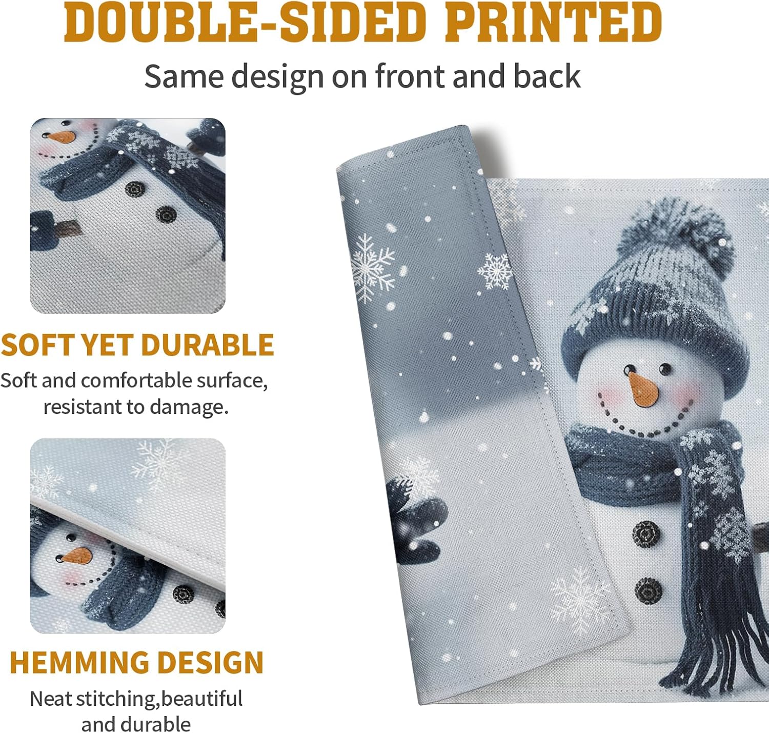 - LINEN FABRIC: Christmas snowman snowflakes placemats mainly made of cotton linen, which is soft, durable and wrinkle-proof, will protect your glass or wood table from scratches, spills, food and anything else of the like